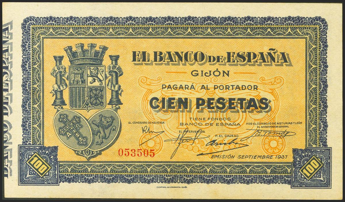 100 pesetas. September 1937. Asturias and León. No serie. (Edifil 2021: 399). original sizing Uncirculated.