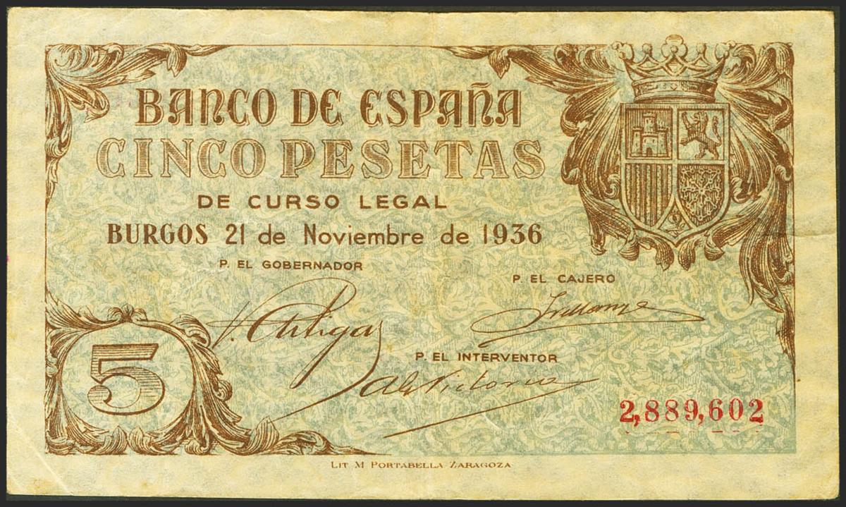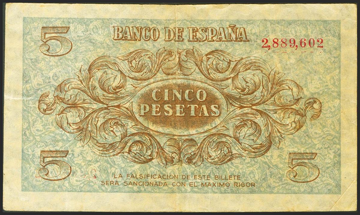 English 5 pesetas. November 21, 1936. No series. (Edifil 2021: 417). Rare, without repairs. Very Fine.
