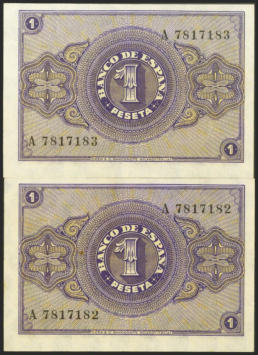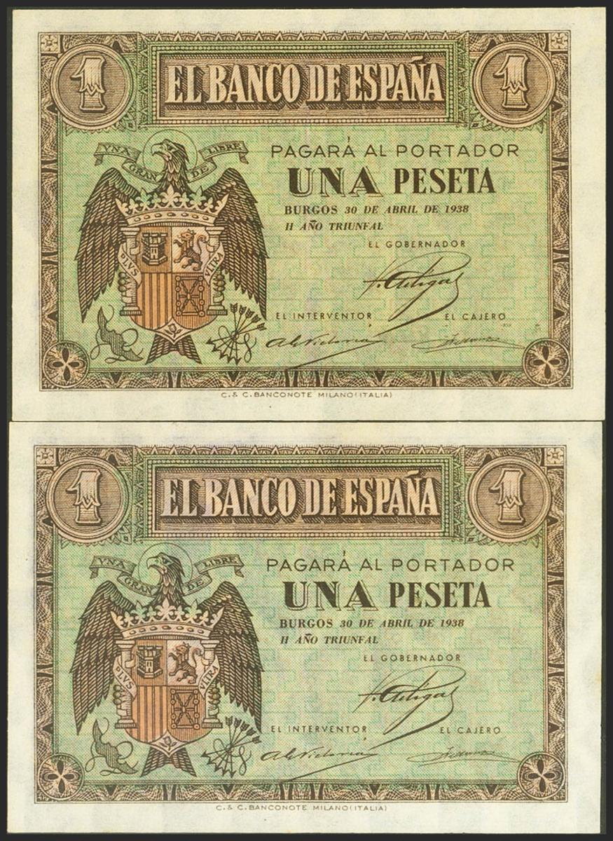 English 1 peseta. April 30, 1938. Correlative couple. Series A. (Edifil 2021: 428). It retains part of the original sizing. Good Extremely Fine.