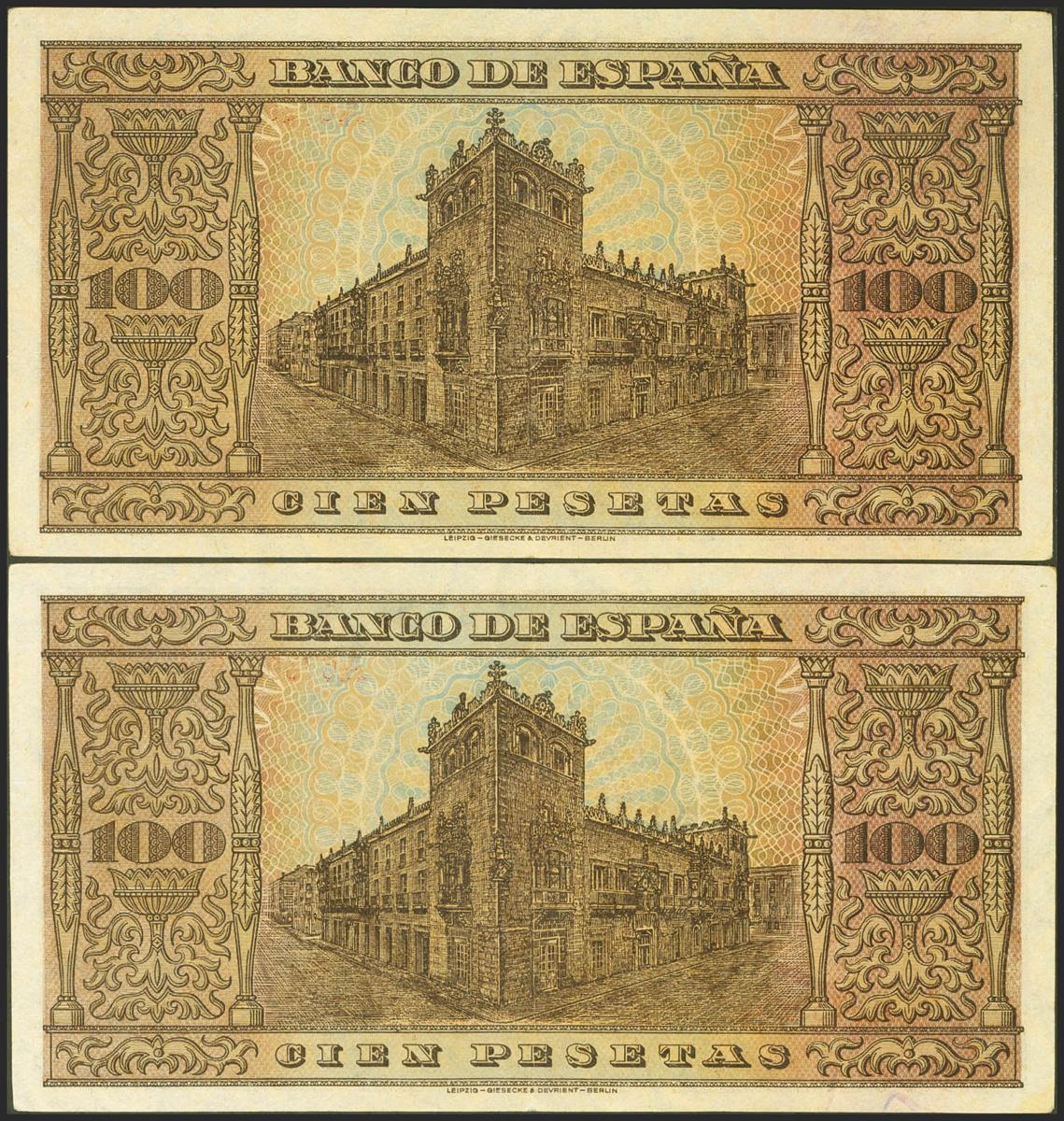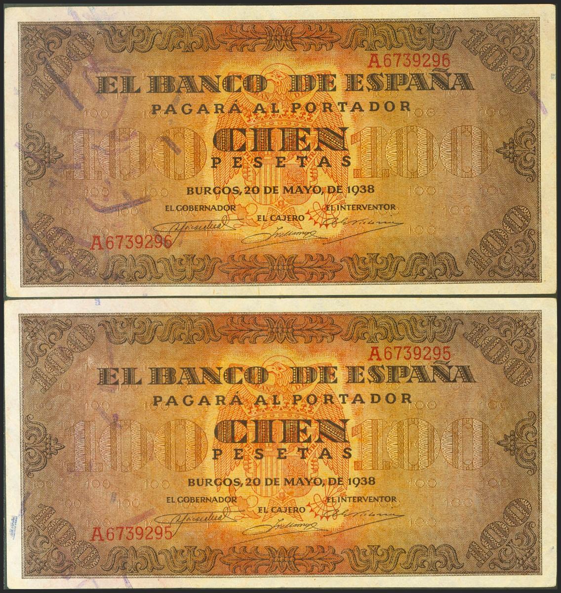 100 pesetas. May 20, 1938. Correlative couple. Series A. (Edifil 2017: 432). It retains part of the original sizing. EBC++.