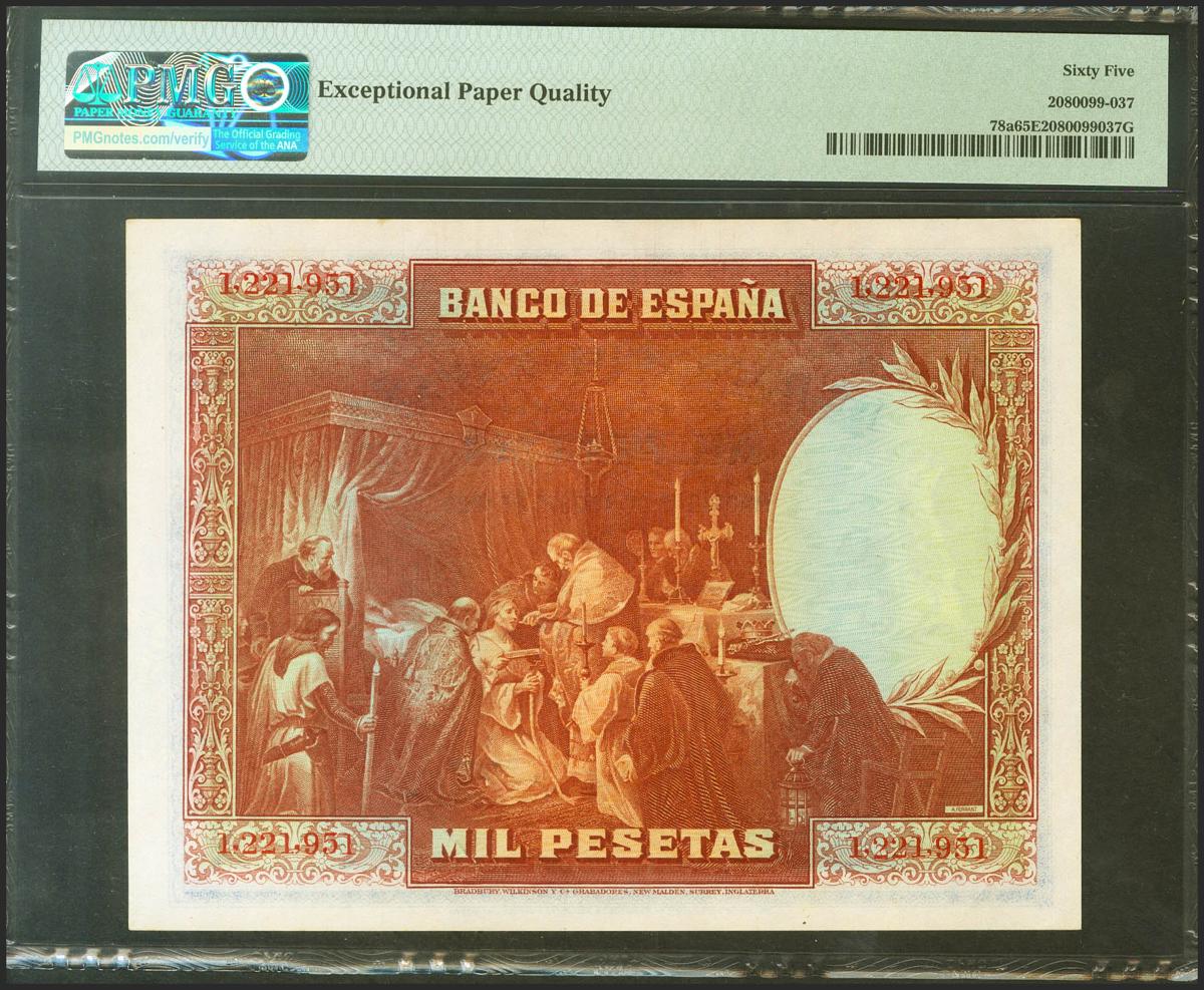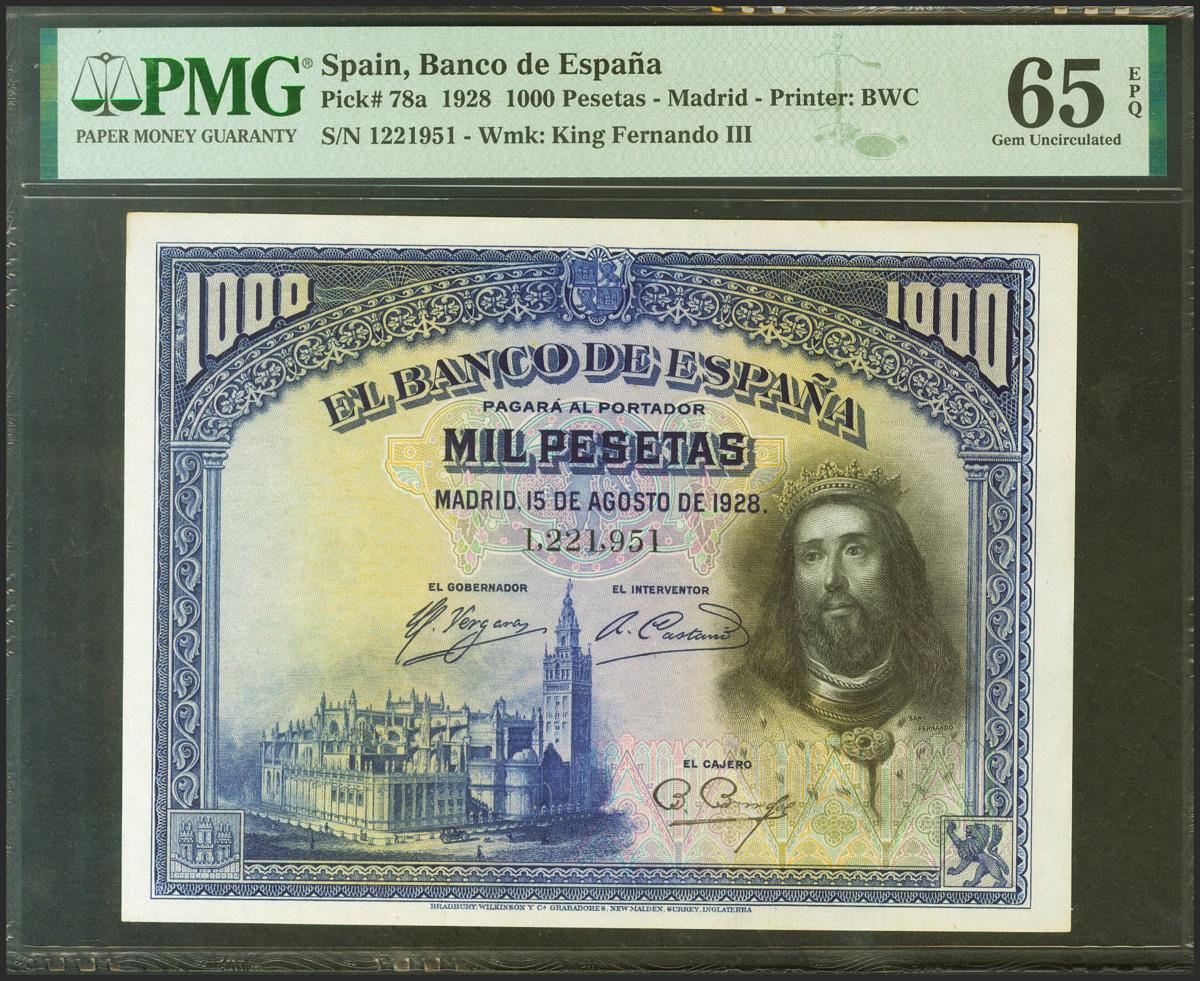 1000 pesetas. August 15, 1928. No series. (Edifil 2017: 357, Pick: 78a). original sizing Uncirculated. PMG65EPQ package.