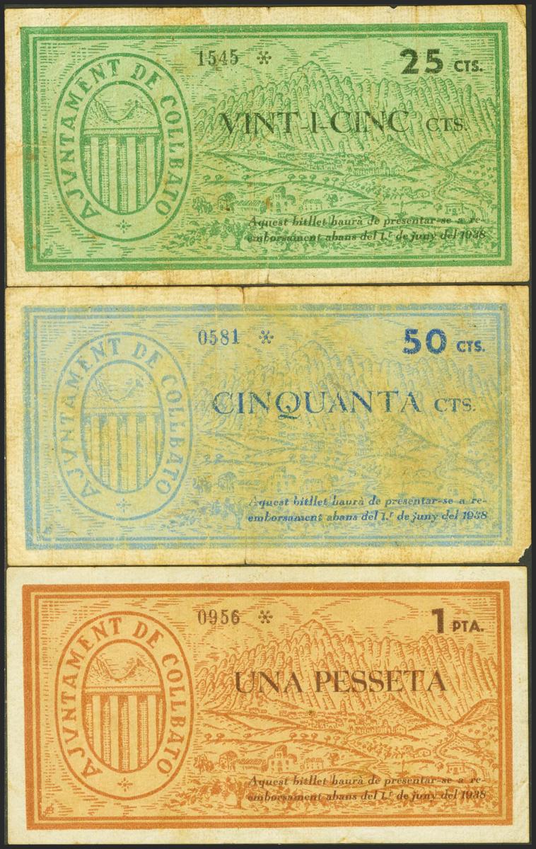 COLLBATO (BARCELONA). 25 Cents, 50 Cents and 1 Peseta. (1937ca). (González: 7632/34). Rare complete series, missing in the corner at 50 cts. Very Fine.