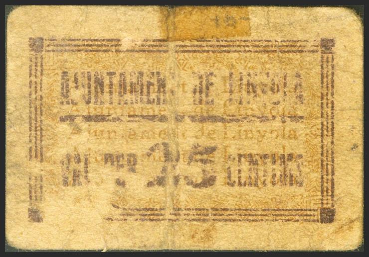 LINYOLA (LERIDA). 25 cents. (1938ca). (Gonzalez: 8317). Very rare. Almost Very Fine.