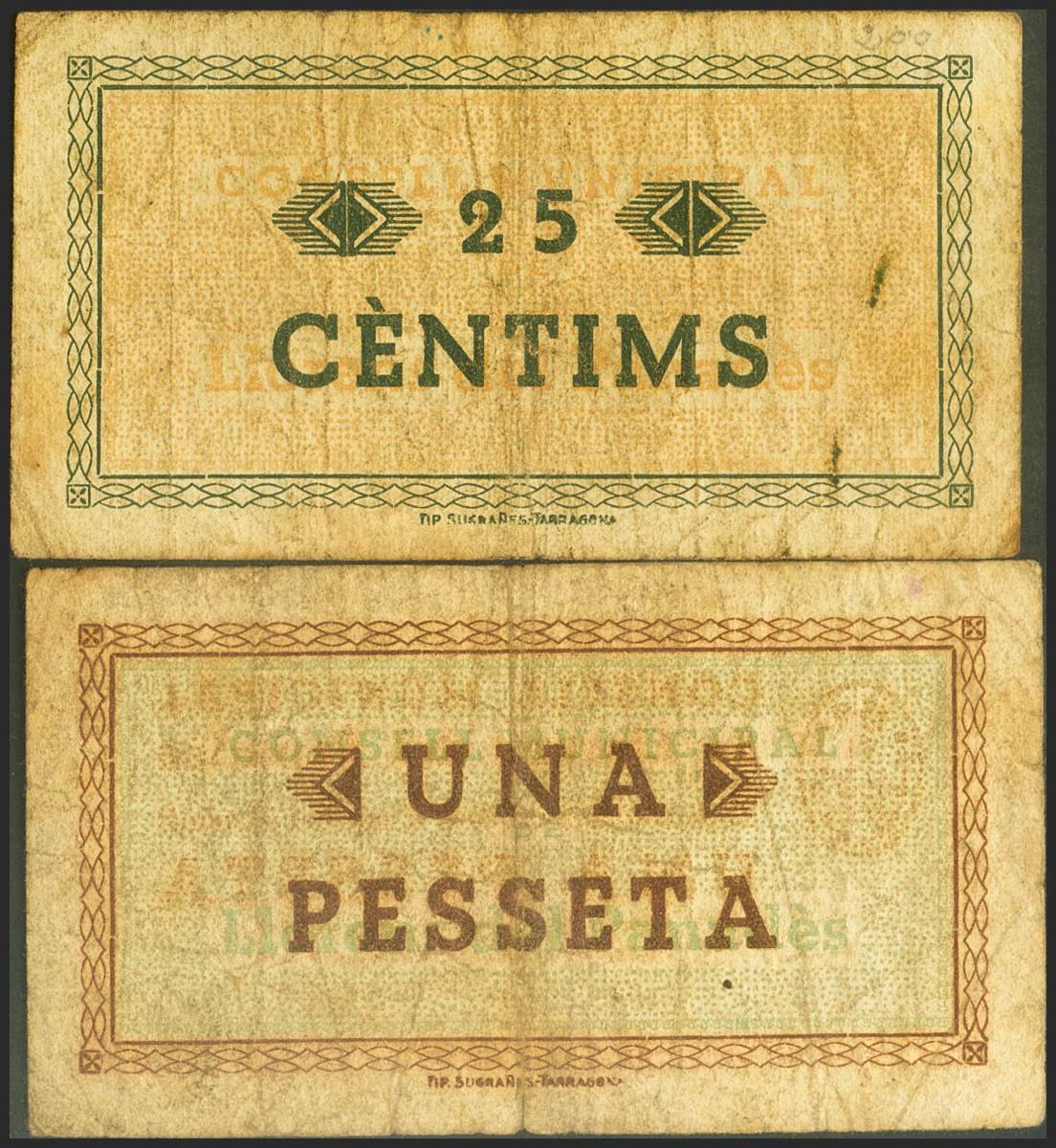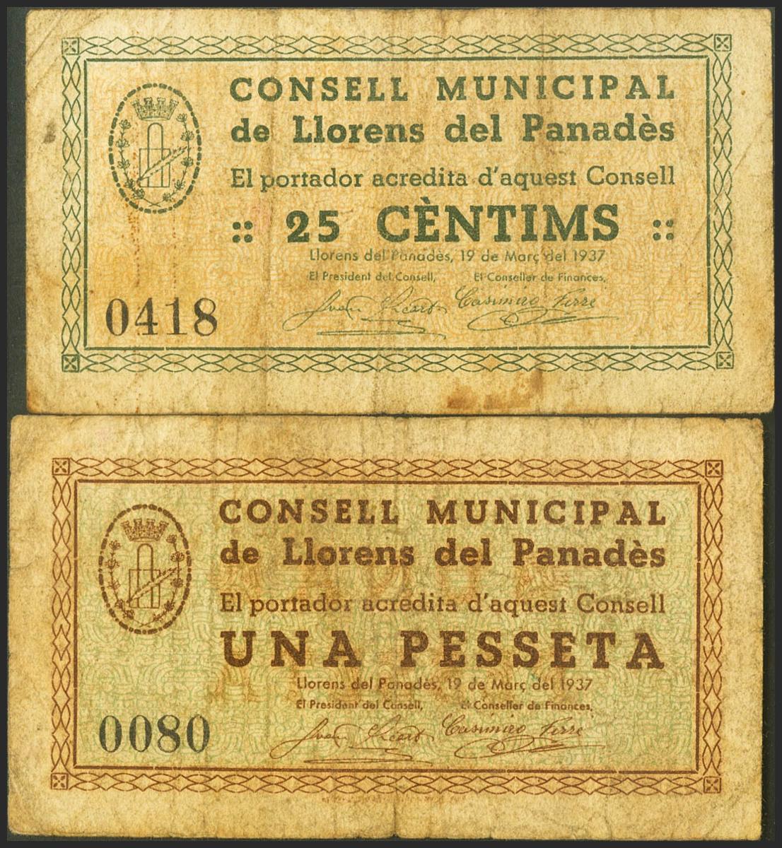 LLORENS DEL PENEDES (TARRAGONA). 25 Cents and 1 Peseta. March 1937. (González: 8429/30). Almost Very Fine.