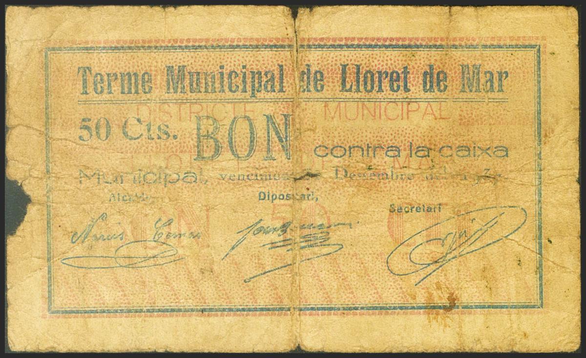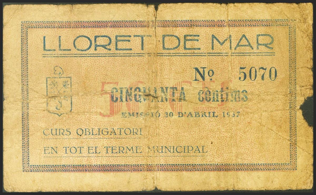 English LLORET DE MAR (GERONA). 50 cents. April 30, 1937. (González: 8435). Very rare. Almost Good.
