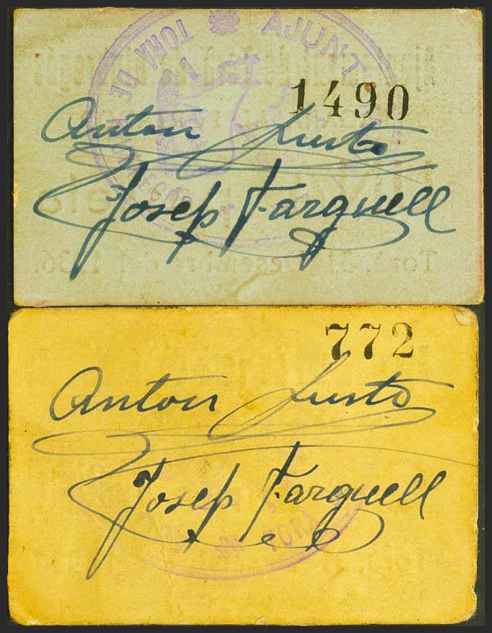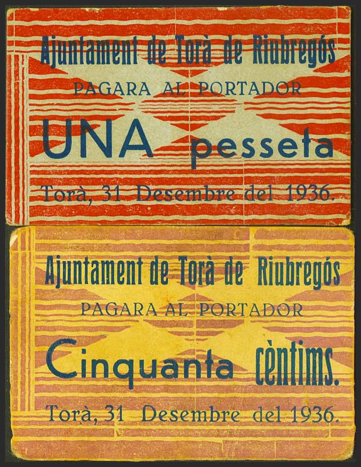 English TORA DE RIUBREGOS (LERIDA). 50 Cents and 1 Peseta. December 31, 1936. (González: 10295/96). Rare complete series. Extremely Fine.