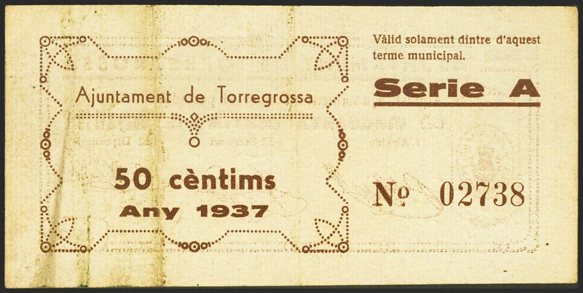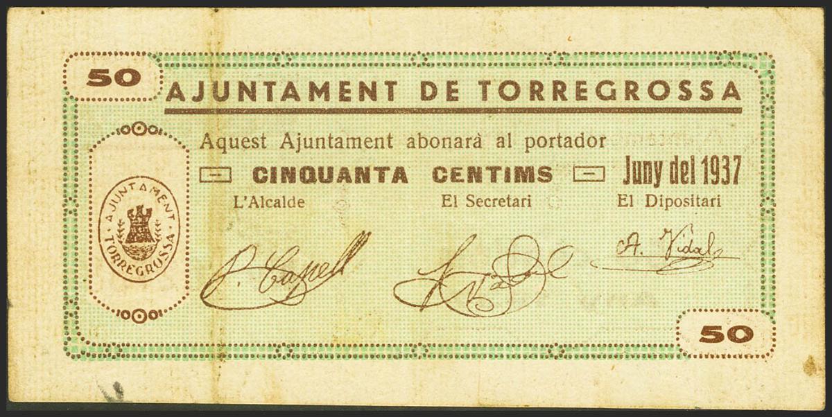 English TORREGROSSA (LERIDA). 50 cents. June 1937. Series A. (González: 10361). Very rare. Very Fine.
