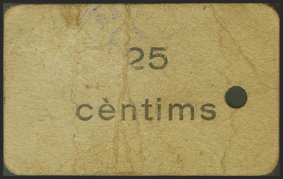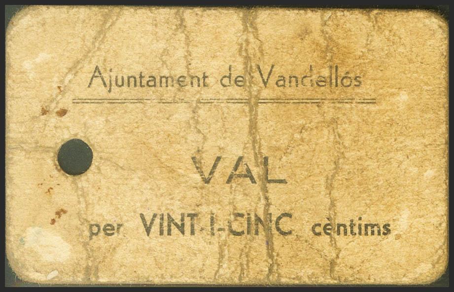 VANDELLOS (TARRAGONA). 25 cents. (1937ca). (Gonzalez: 10588). Rare, drill. Fine.