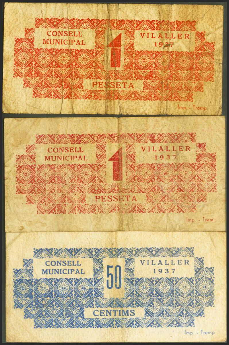 VILALLER (LERIDA). 50 Cents and 1 Peseta (2). 1937. (González: 10747, 10748, 10749). rare. Very Fine.