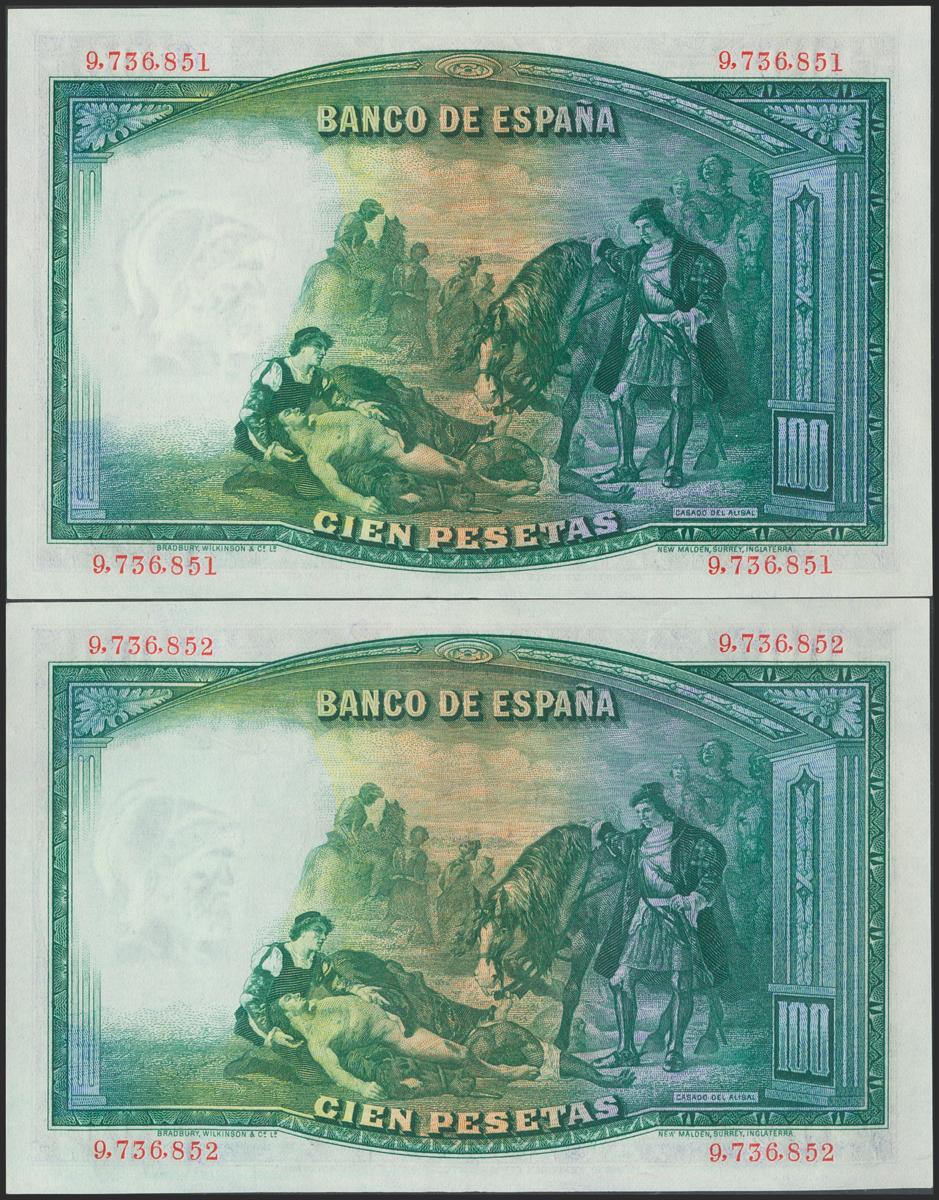 100 pesetas. April 25, 1931. Correlative couple. No serie. (Edifil 2017: 360). It retains all its original sizing. Uncirculated.