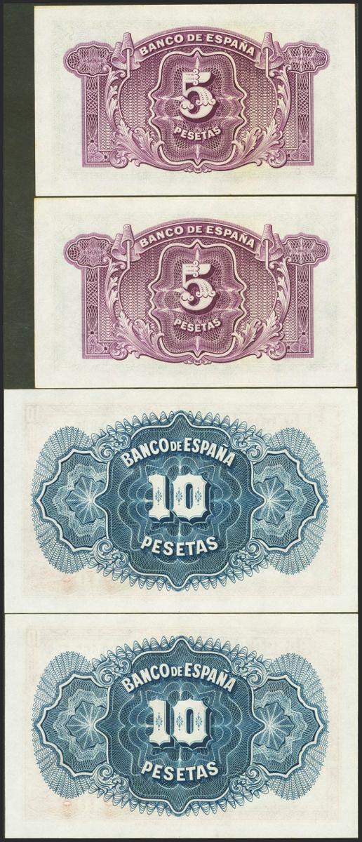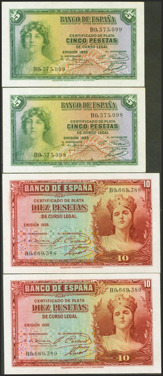 5 Pesetas and 10 Pesetas. 1935. Correlative couples. Silver Certificate. Series B. (Edifil 2021: 363a, 364a). Uncirculated.