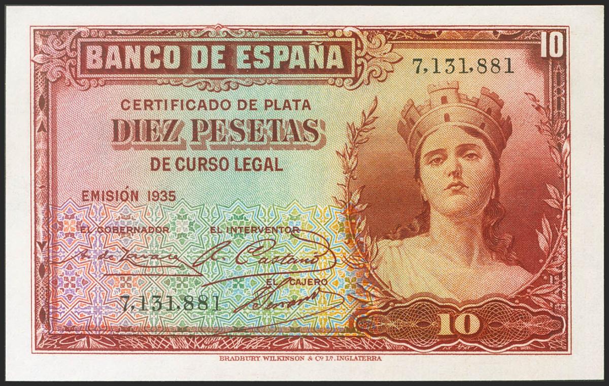 English 10 pesetas. 1935. Silver Certificate. No serie. (Edifil 2021: 364). It retains all its original sizing. Uncirculated.