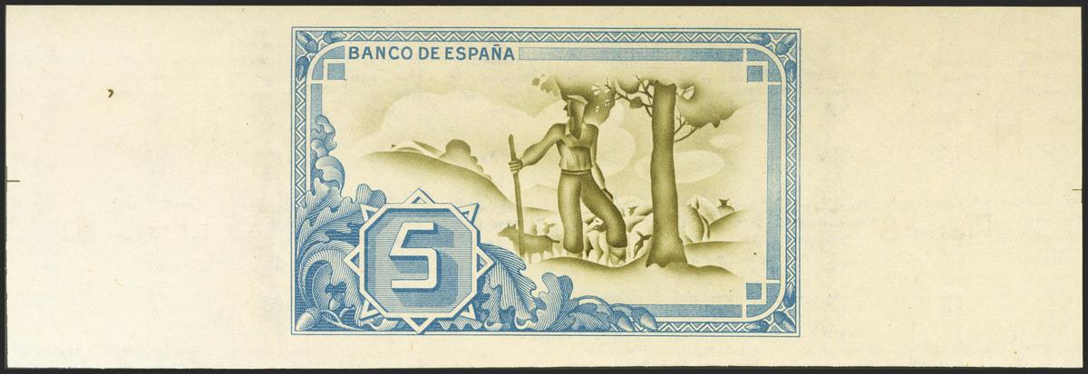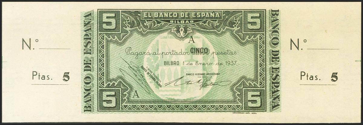 5 pesetas. January 1, 1937. Bilbao branch, presigned Banco Hispano Americano. Series A and without numbering, with both matrices. (Edifil 2021: 386a). original sizing Almost Uncirculated.