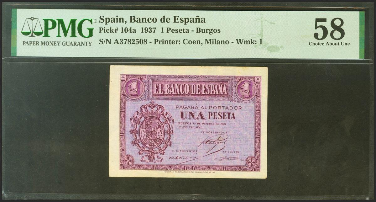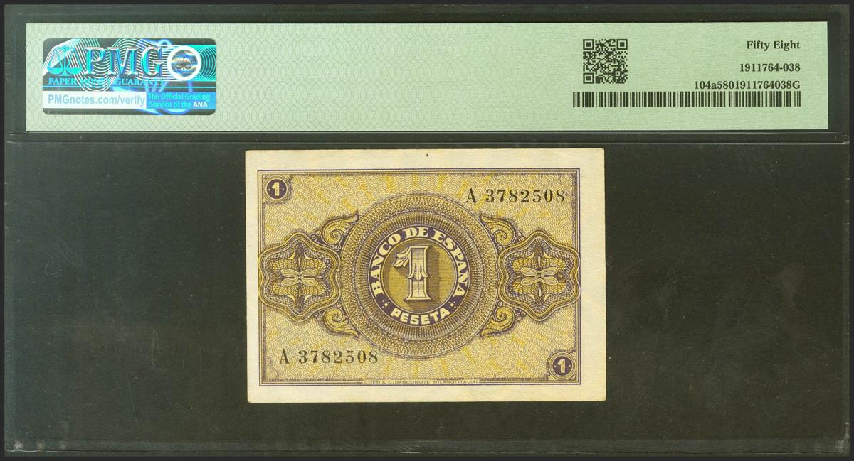 English 1 peseta. October 12, 1937. Series A. (Edifil 2021: 425, Pick: 104a). EBC++. PMG58 encapsulation.