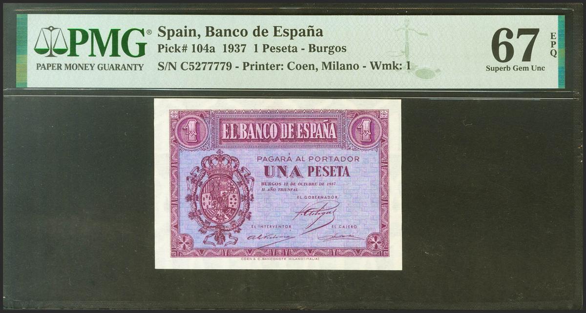 1 peseta. October 12, 1937. Series C. (Edifil 2021: 425a, Pick: 104a). Very rare in this exceptional quality, original sizing. Uncirculated. PMG67EPQ package.