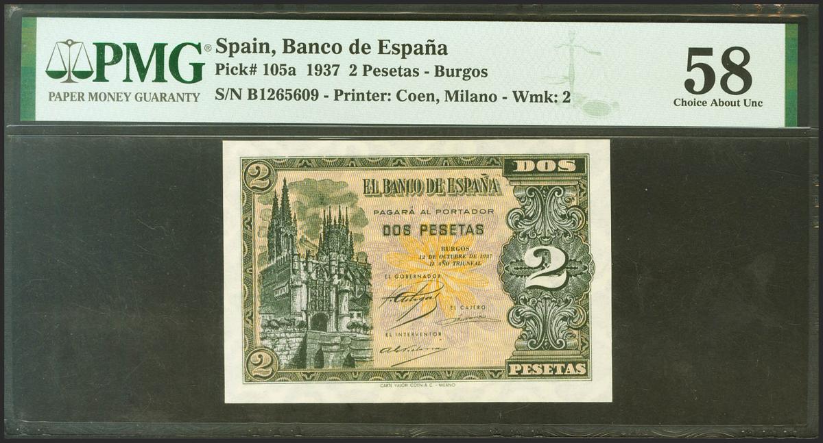 2 pesetas. October 12, 1937. Series B. (Edifil 2021: 426a, Pick: 105a). EBC++. PMG58 encapsulation.