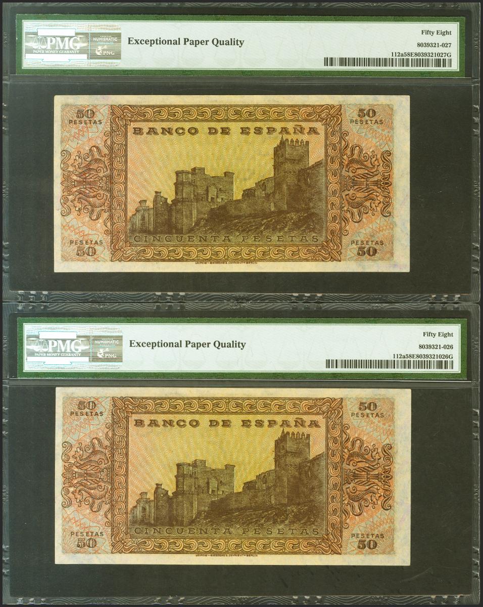 50 pesetas. May 20, 1938. Correlative couple. Series D. (Edifil 2021: 431a, Pick: 112a). Very attractive and unusual pair, original sizing. EBC+++. PMG58EPQ packages, both.