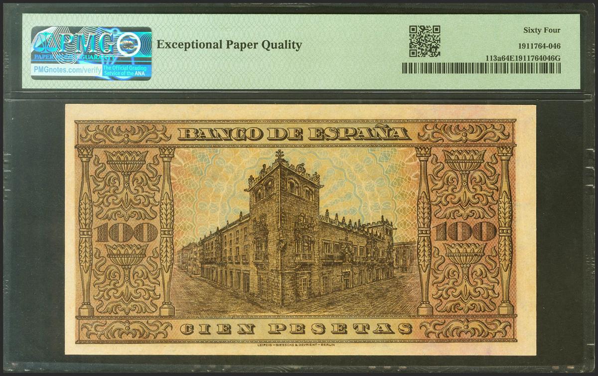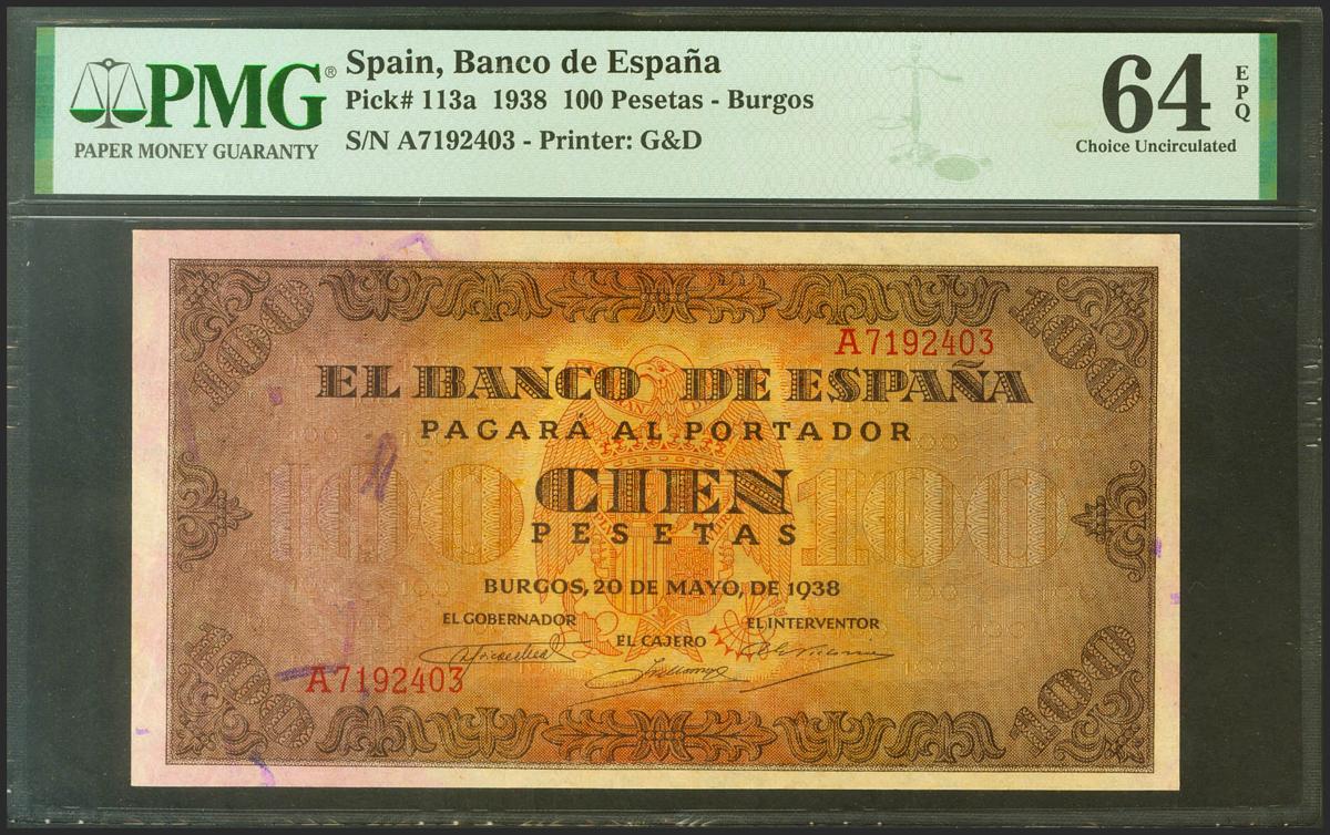 100 pesetas. May 20, 1938. Series A. (Edifil 2021: 432). original sizing Uncirculated. PMG64EPQ package.