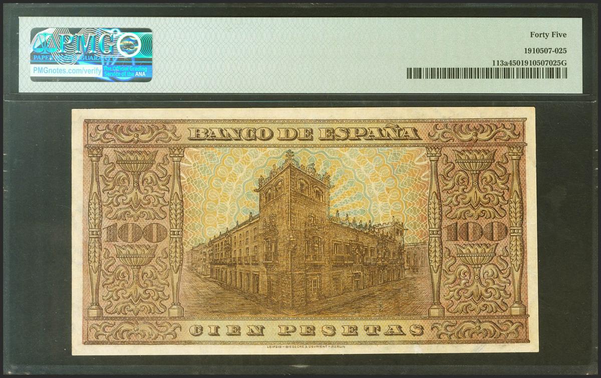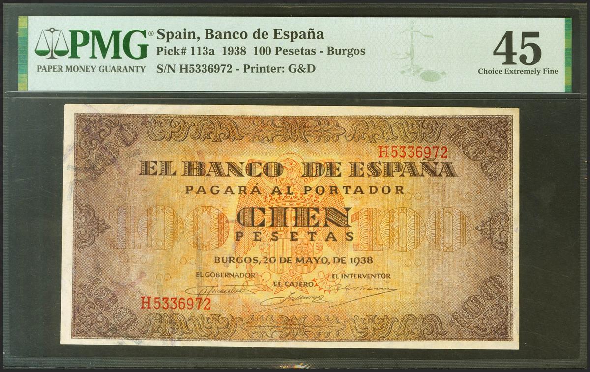 100 pesetas. May 20, 1938. Series H, last series issued. (Edifil 2021: 432a, Pick: 113a). Extremely Fine. PMG45 package.