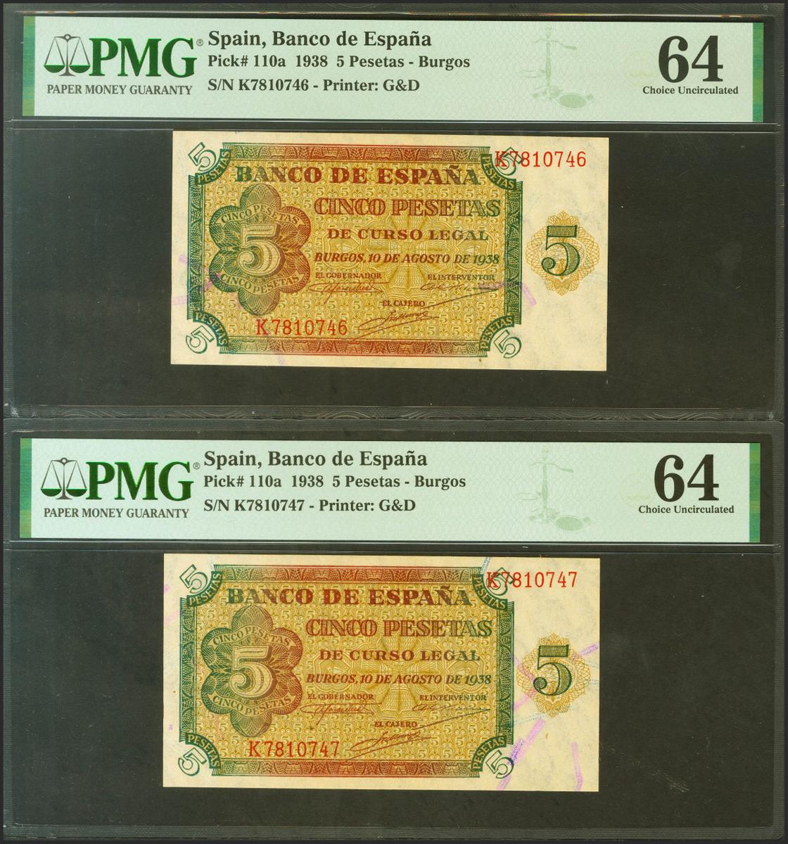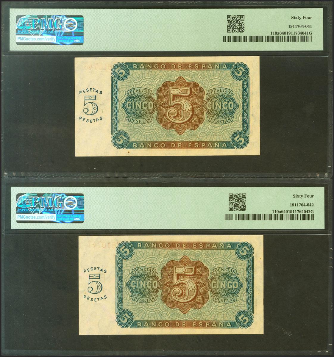 5 pesetas. August 10, 1938. Correlative couple. Series K. (Edifil 2021: 435a, Pick: 110a). Uncirculated. PMG64 packages, both.