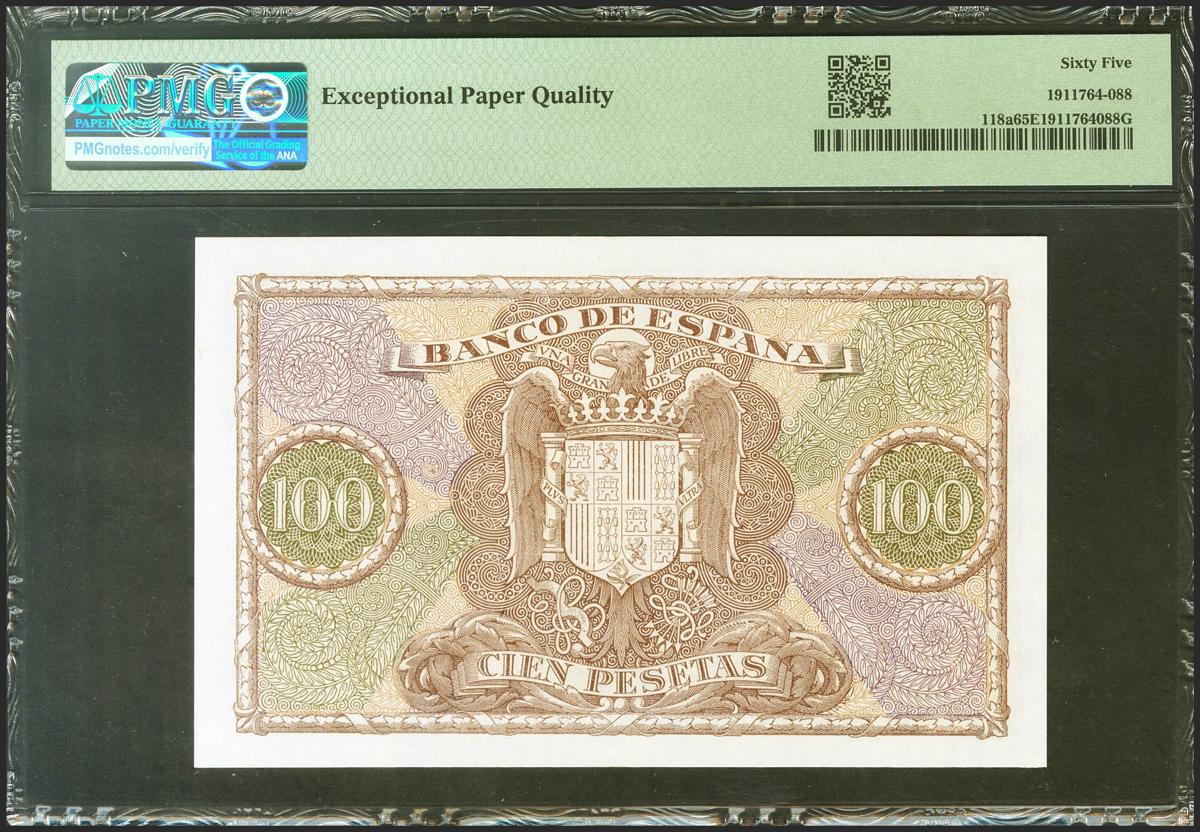 English 100 pesetas. January 9, 1940. Series C. (Edifil 2021: 438a, Pick: 118a). Rare in this exceptional quality, original sizing. Uncirculated. PMG65EPQ package.