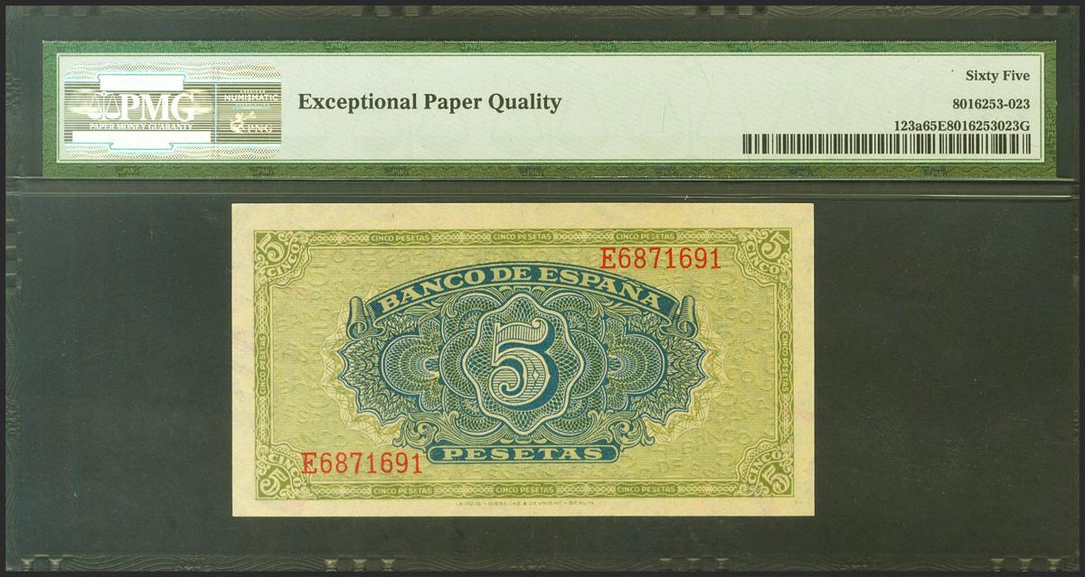 5 pesetas. September 4, 1940. Series E. (Edifil 2021: 443a). Rare in this exceptional quality, original sizing. Uncirculated. PMG65EPQ package.