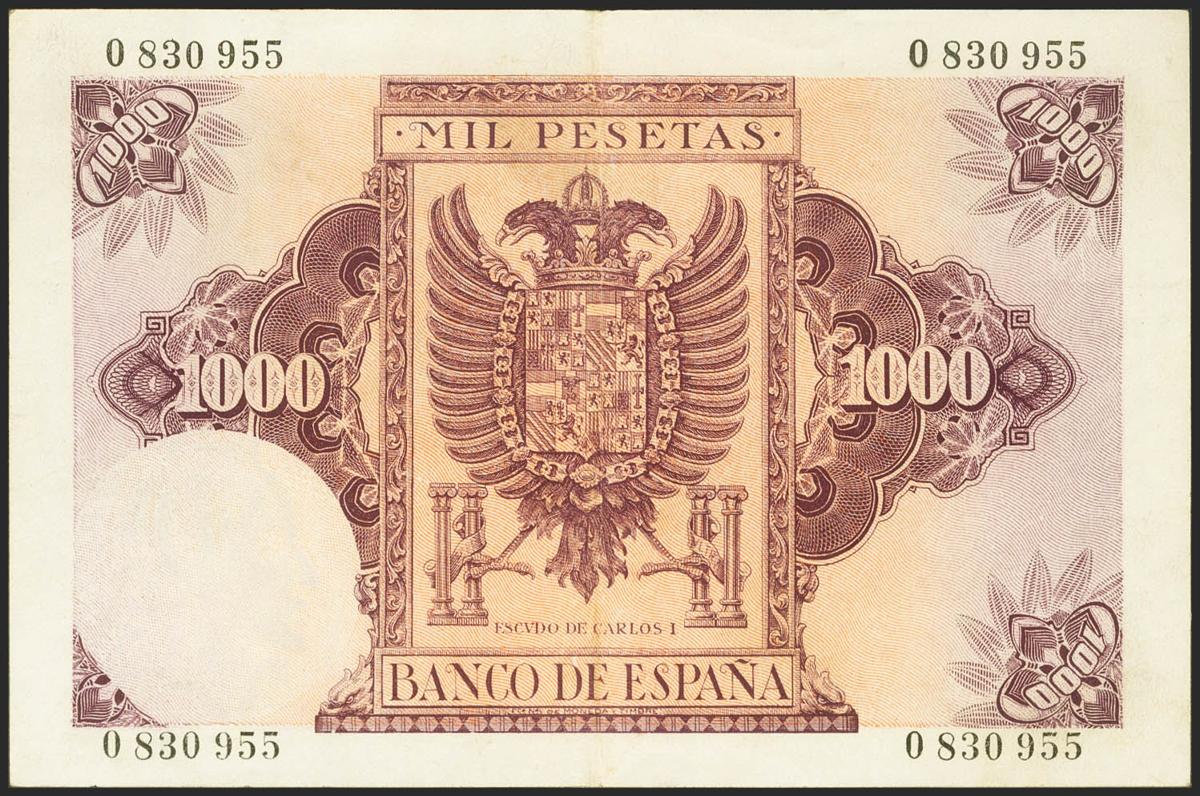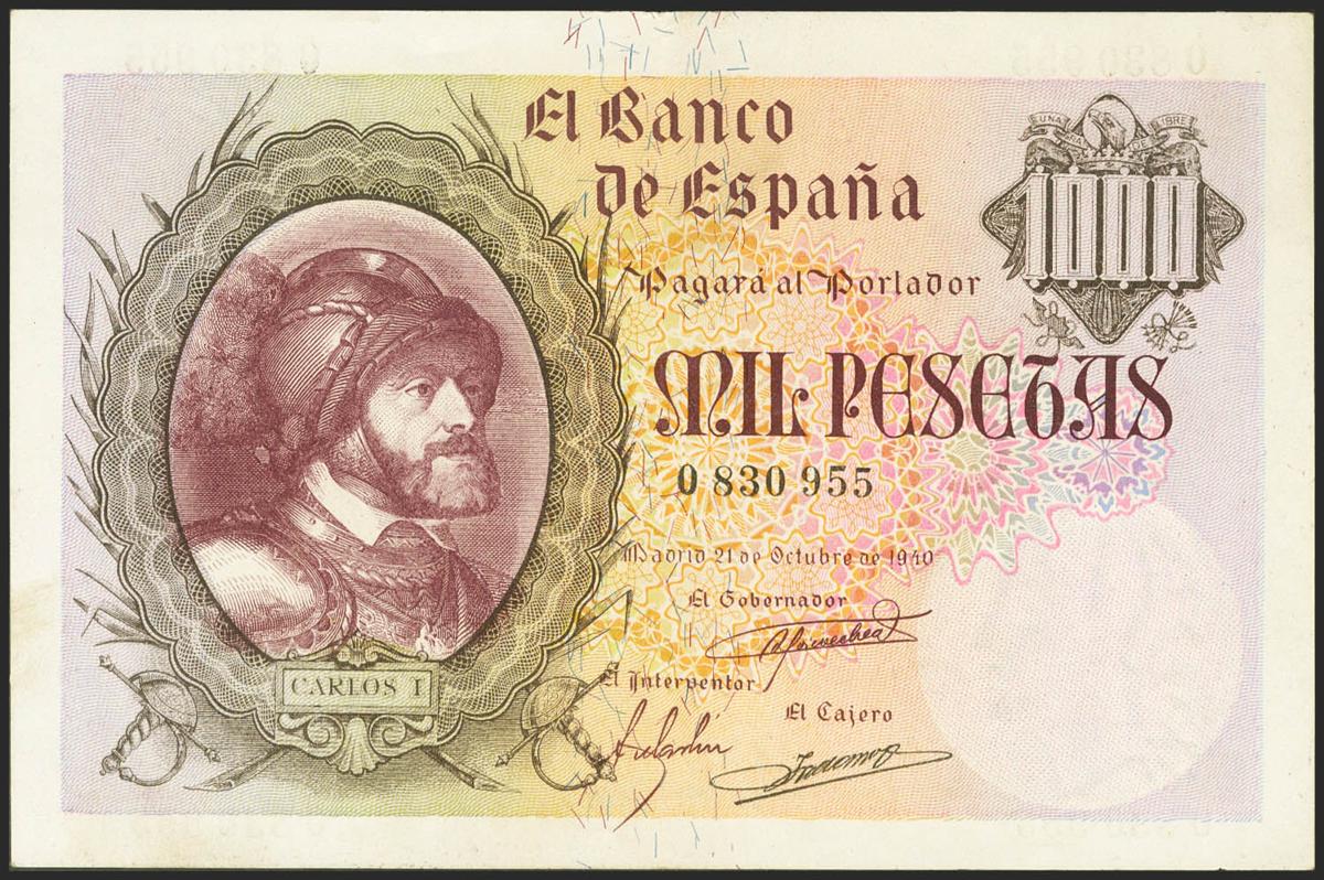 1000 pesetas. October 21, 1940. Without series. (Edifil 2021: 445). Rare in this quality, preserving part of its original sizing, enormously attractive banknote. Extremely Fine.