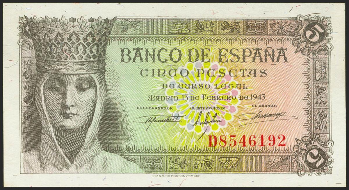 5 pesetas. February 13, 1943. Series D. (Edifil 2021: 446a). It retains much of its original size. EBC+++.