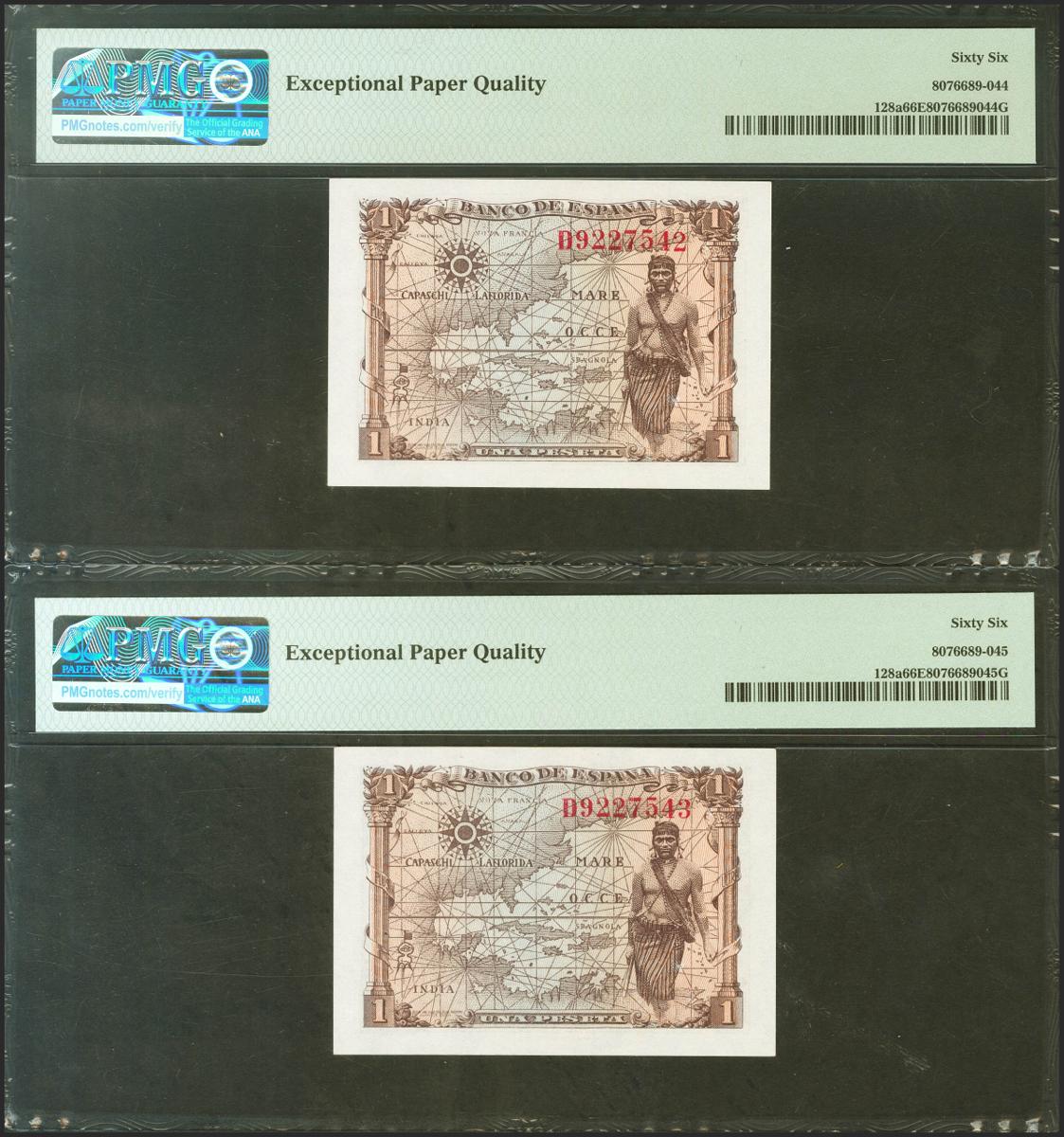 1 peseta. June 15, 1945. Correlative couple. Series D. (Edifil 2017: 448a, Pick: 128a). Rare in this exceptional quality and original sizing. Uncirculated. PMG66EPQ packages, both.