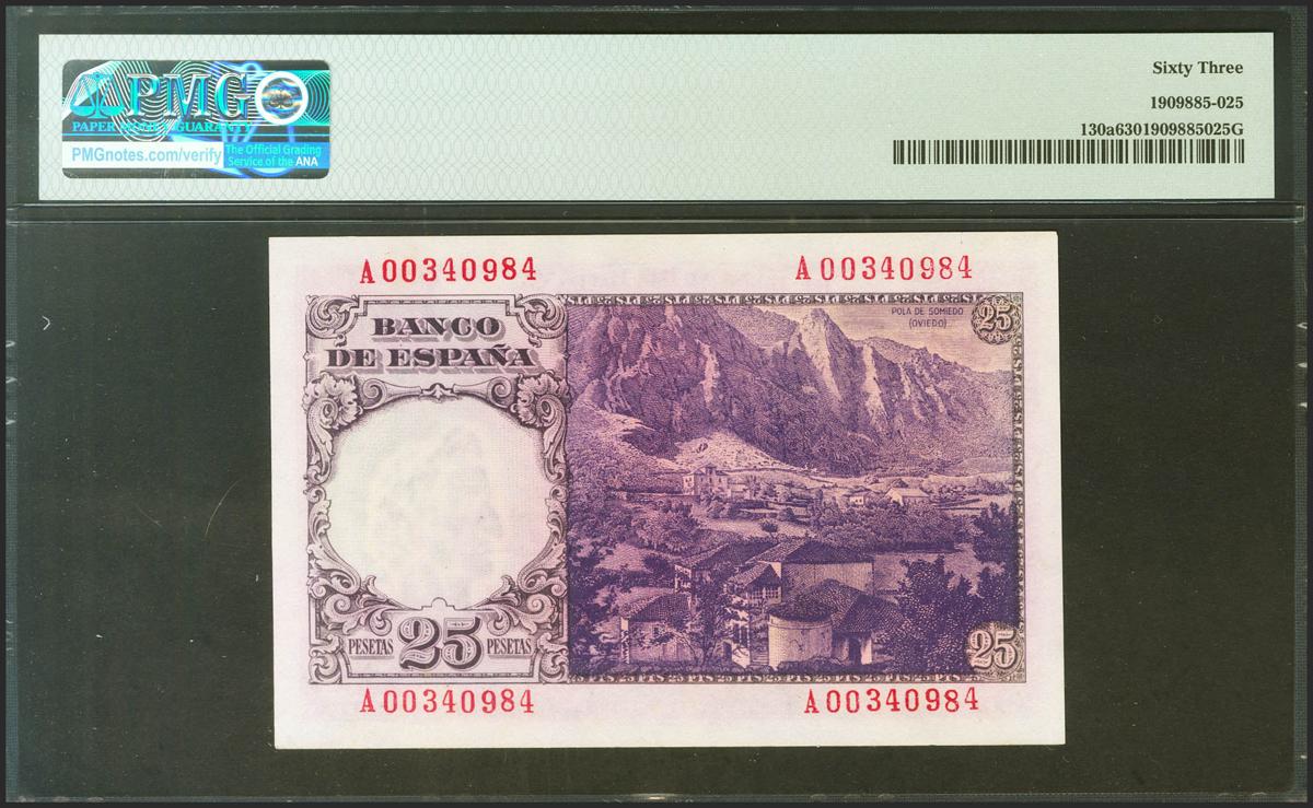 25 pesetas. February 20, 1946. Series A. (Edifil 2021: 450a, Pick: 130a). Uncirculated. PMG63 package.