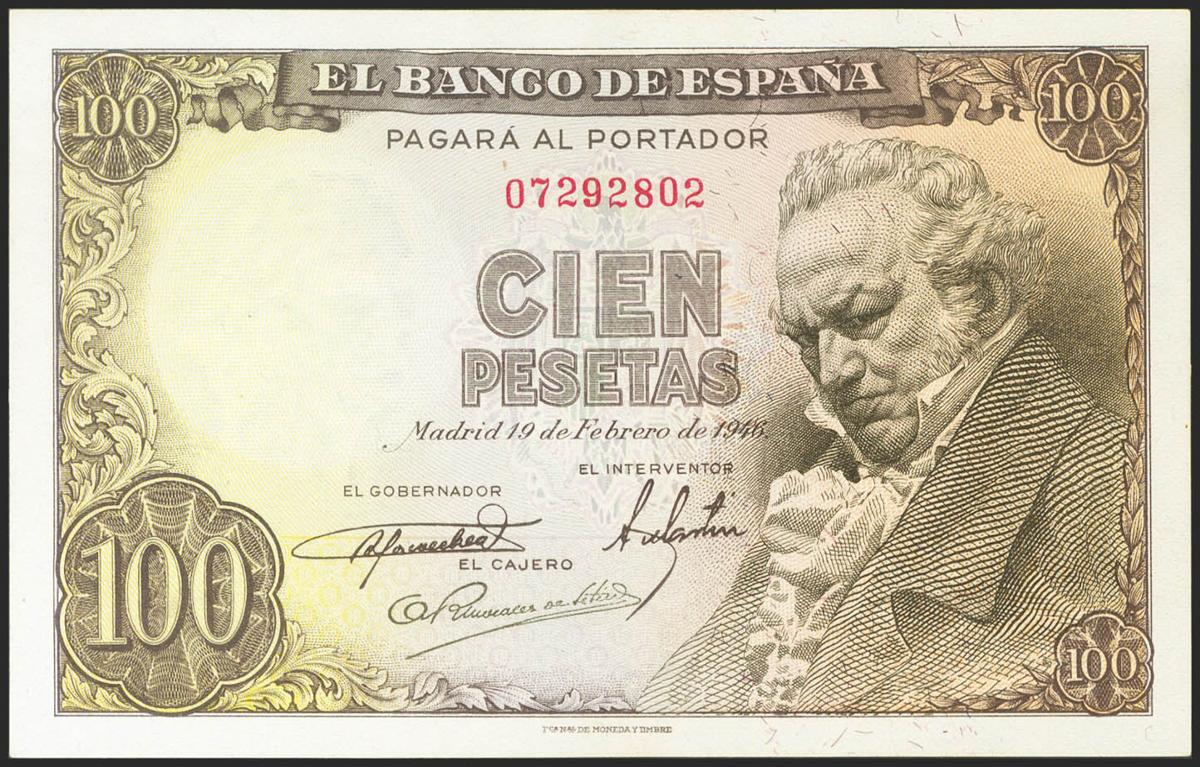 100 pesetas. February 19, 1946. No series. (Edifil 2021: 451). It retains much of its original size. Good Extremely Fine.