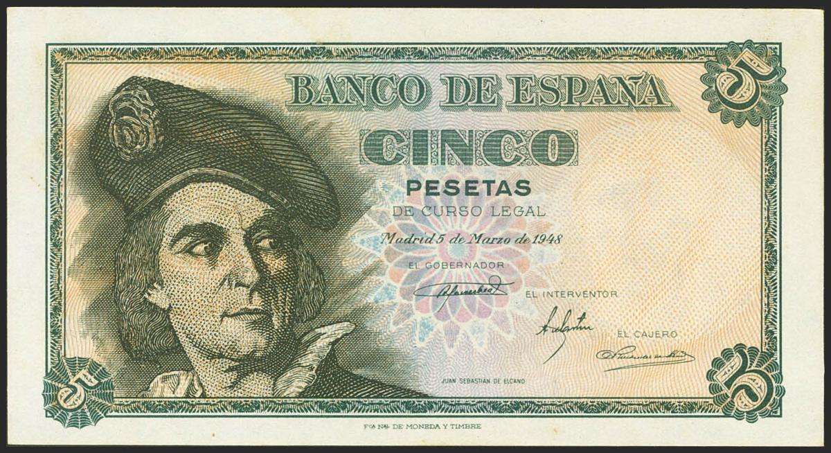 5 pesetas. March 5, 1948. Series A. (Edifil 2021: 455a). original sizing Almost Uncirculated.