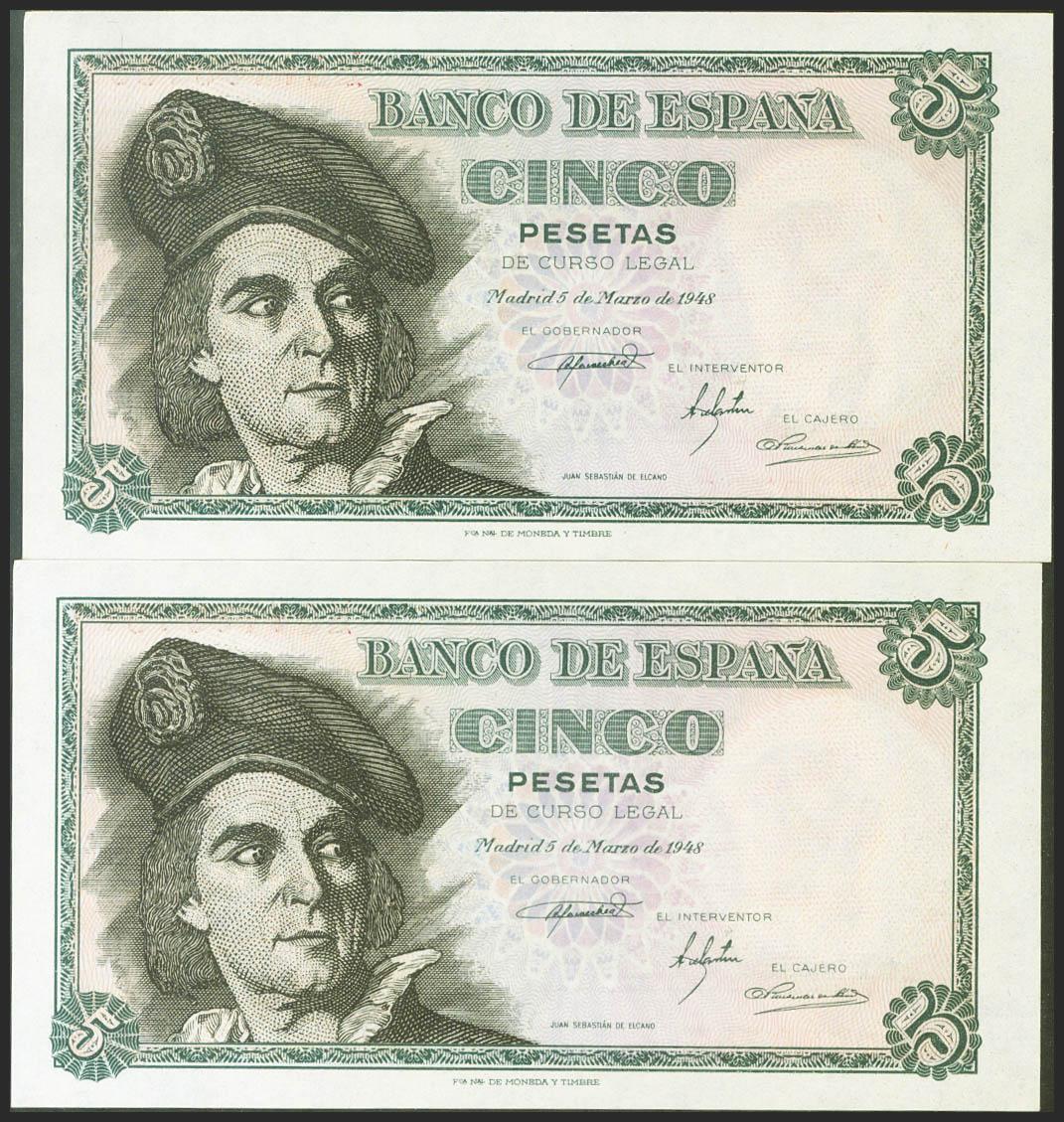 5 pesetas. March 5, 1948. Correlative couple. Series H. (Edifil 2021: 455a). original sizing Uncirculated.