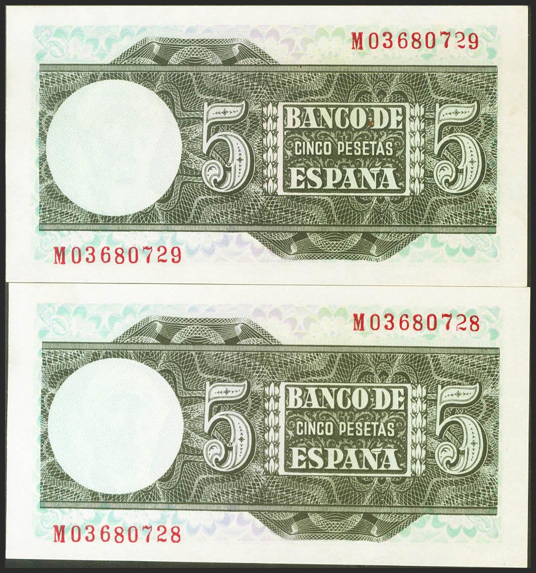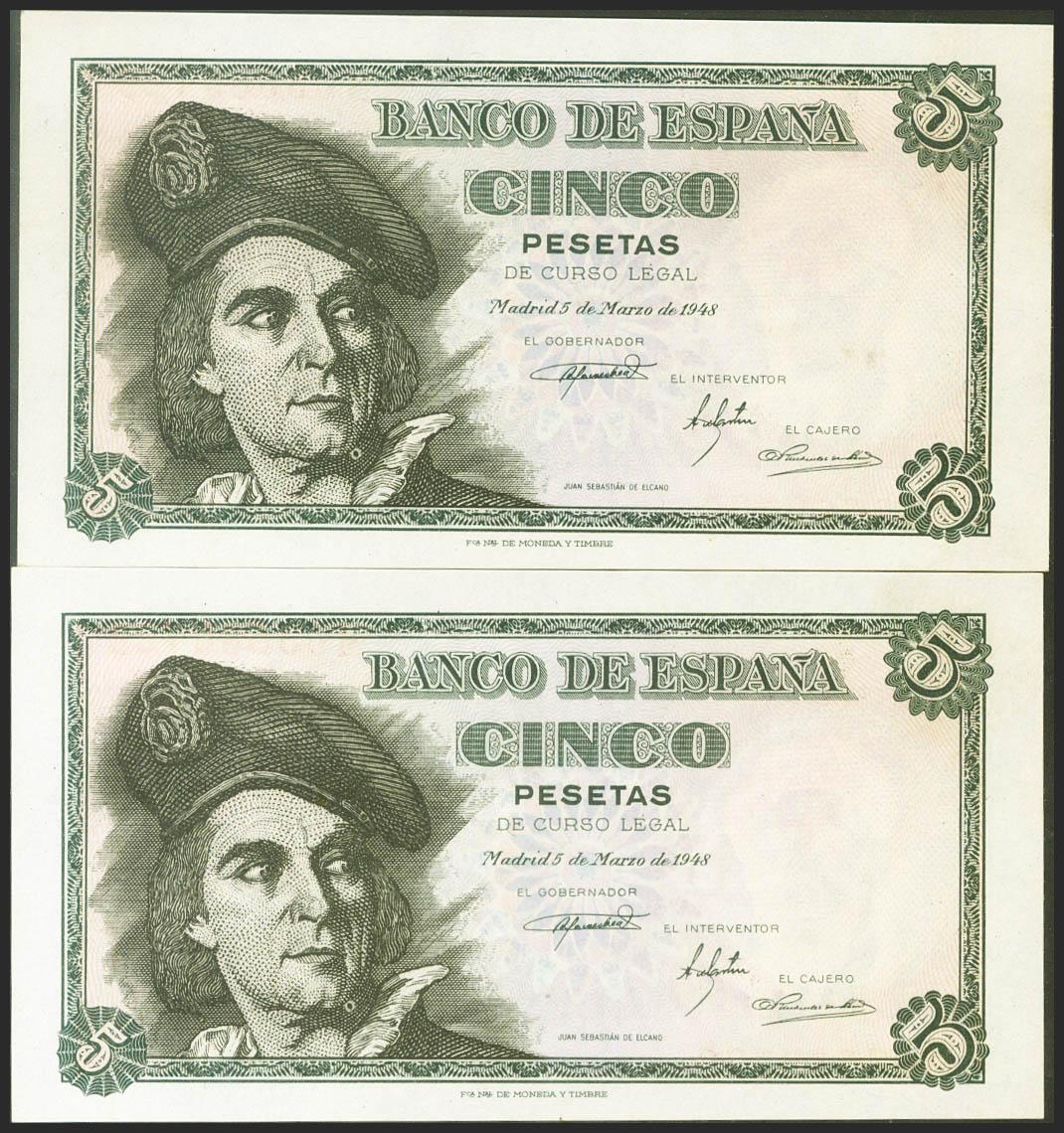 5 pesetas. March 5, 1948. Correlative couple. Series M. (Edifil 2021: 455a). original sizing Uncirculated.