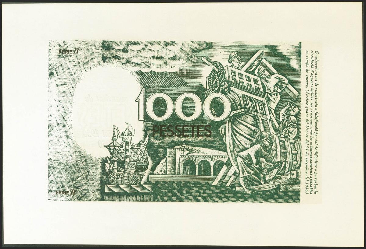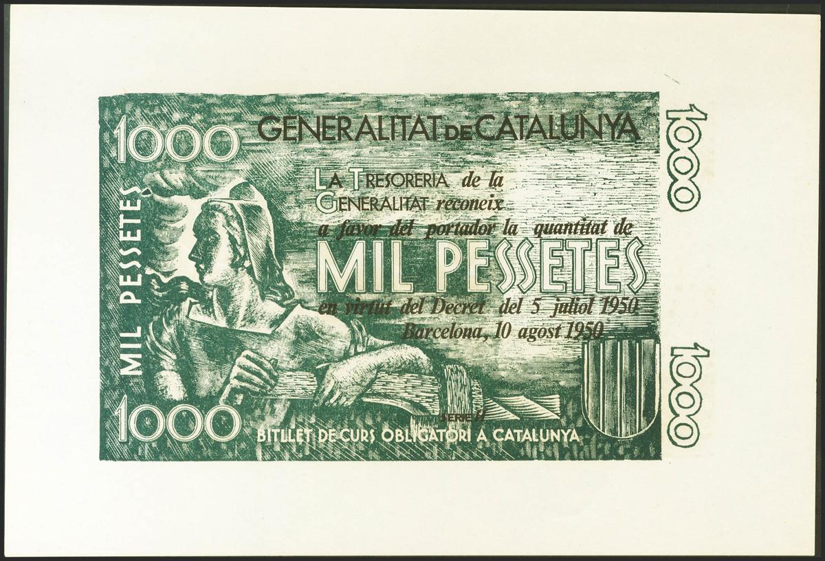 Proof in green of an Unissued 1000 Pesetas Generalitat de Catalunya banknote, issued on August 10, 1950, with the H series (privately issued banknote, without legal backing). Almost Uncirculated.