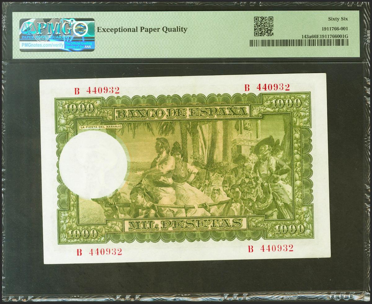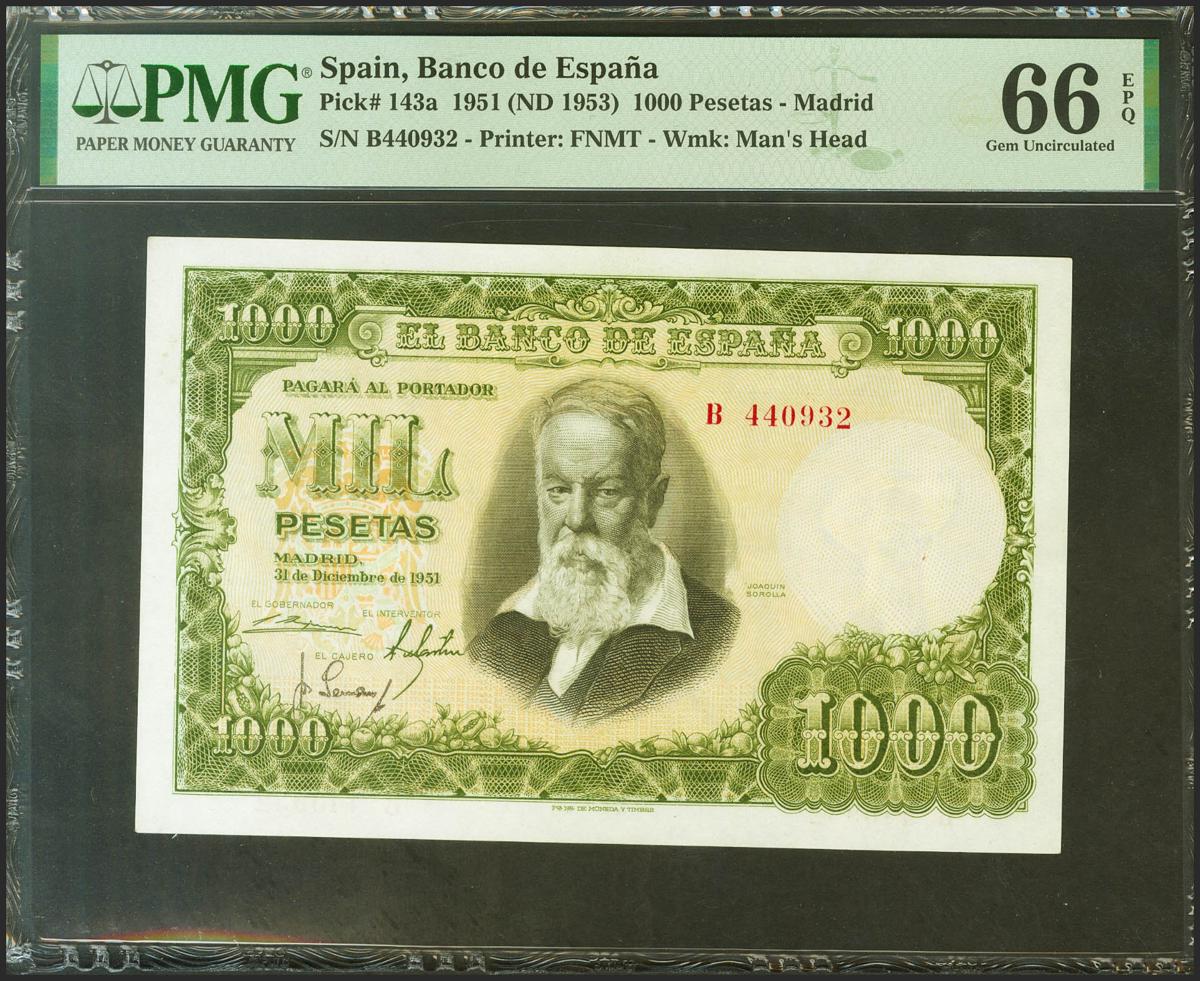 1000 pesetas. December 31, 1951. Series B. (Edifil 2021: 463a). Rare in this quality, original sizing. Uncirculated. PMG66EPQ package. Former Perez Galdos.