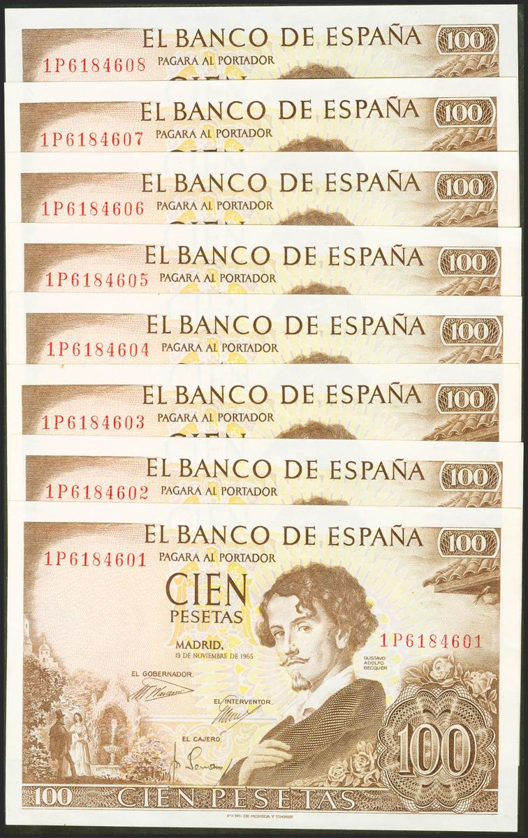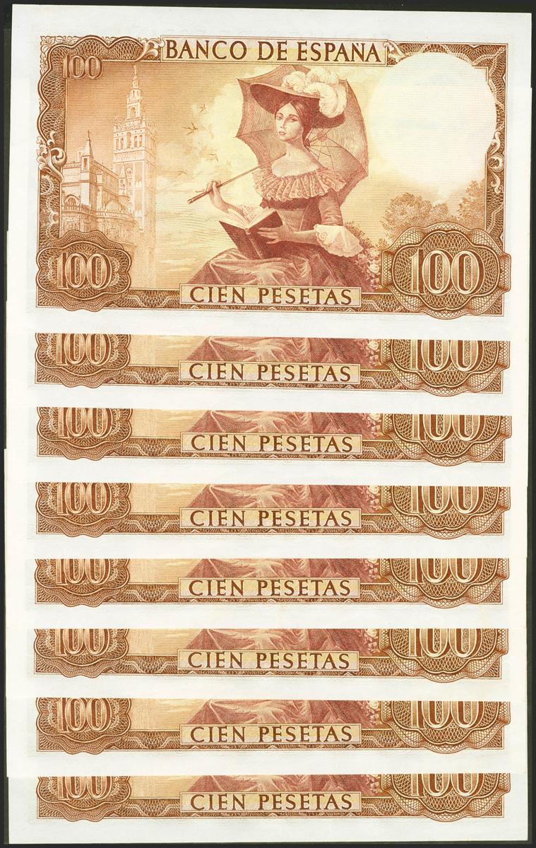 Set of 8 correlative bills of 100 Pesetas, issued on November 19, 1965, with the 1P series (Edifil 2017: 470a), with its original sizing. Uncirculated.