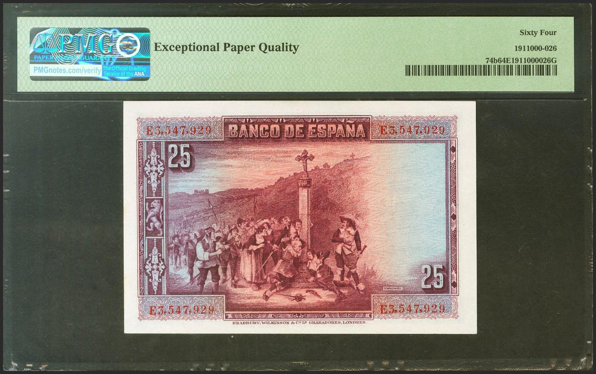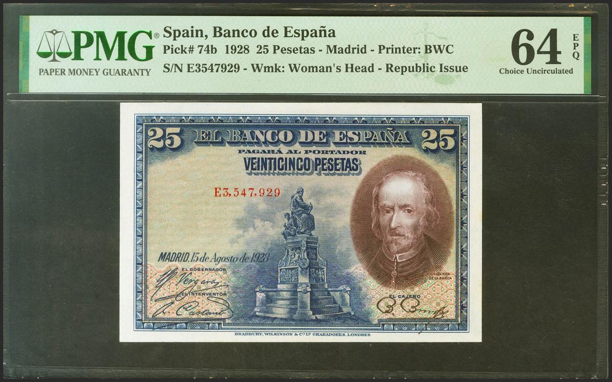 25 pesetas. August 15, 1928. Series E. (Edifil 2021: 353, Pick: 74b). original sizing Uncirculated. PMG64EPQ package.