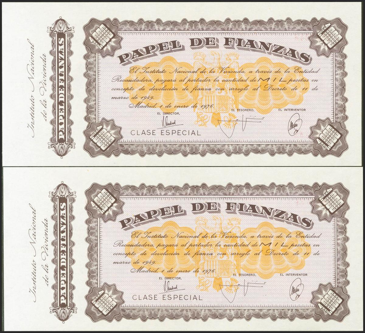1000 pesetas. January 1, 1976. Finance Paper. Correlative pair. Without series and both with matrix of the National Housing Institute. Rare with complete matrix. Almost Uncirculated.