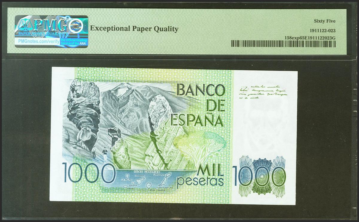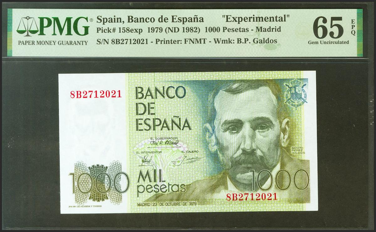 English 1000 pesetas. October 23, 1979. Special series 8B. (Edifil 2021: 477c). Very rare series especially in this exceptional quality. Uncirculated. PMG65EPQ package.