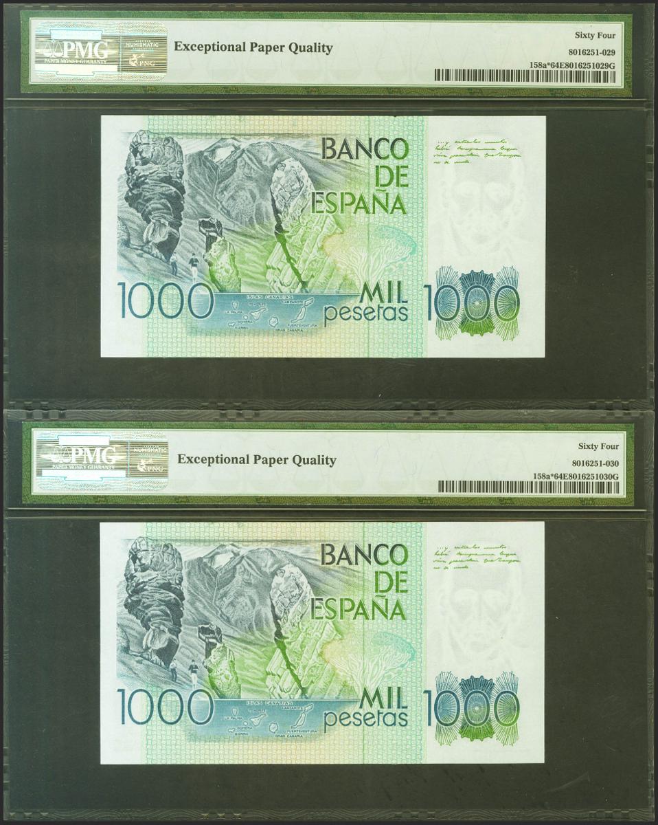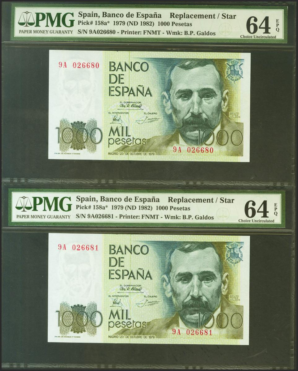 English 1000 pesetas. October 23, 1979. Correlative couple. Special series 9A. (Edifil 2021: 477b, Pick: 158a*). Unusual, original sizing. Uncirculated. PMG64EPQ packages, both.