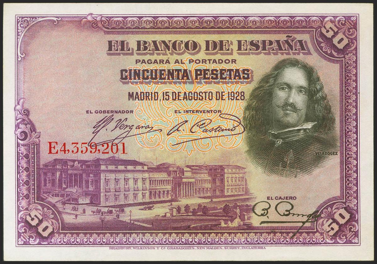 50 pesetas. August 15, 1928. Series E. (Edifil 2021: 354). original sizing Almost Uncirculated.