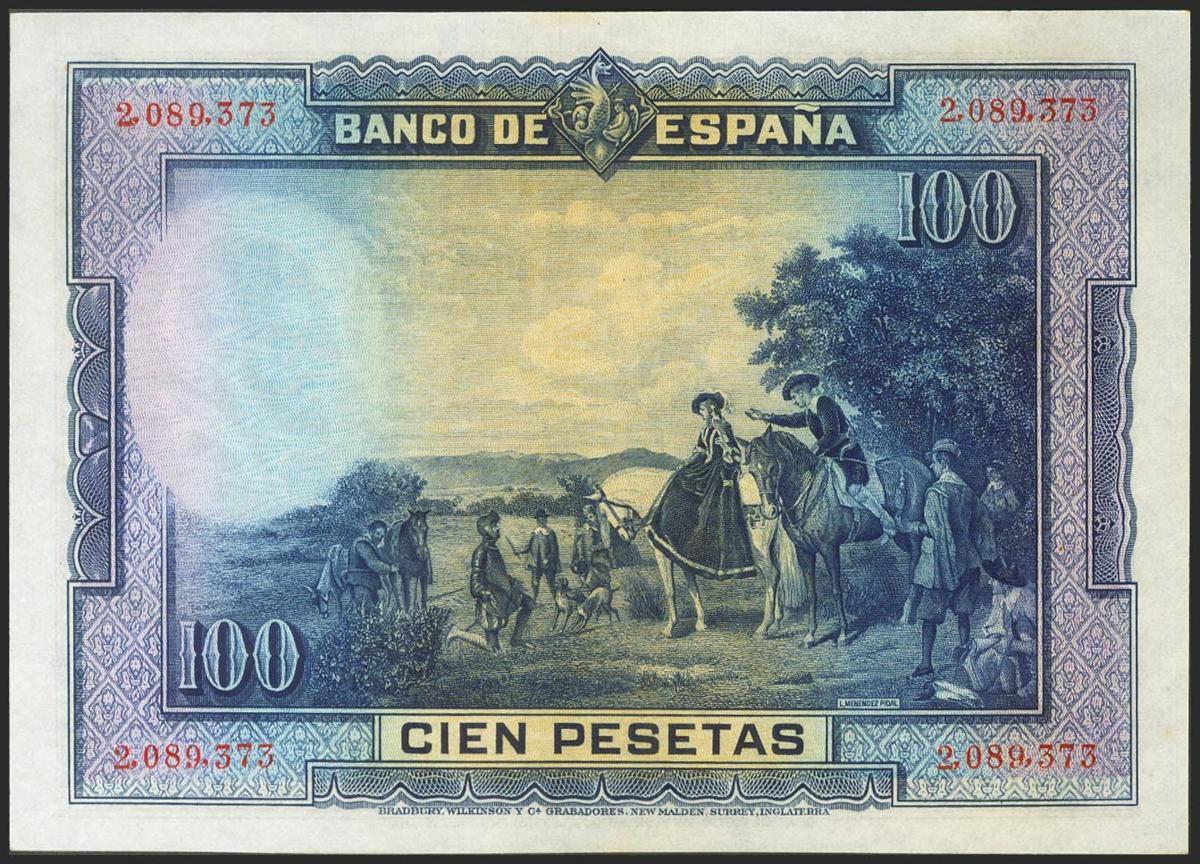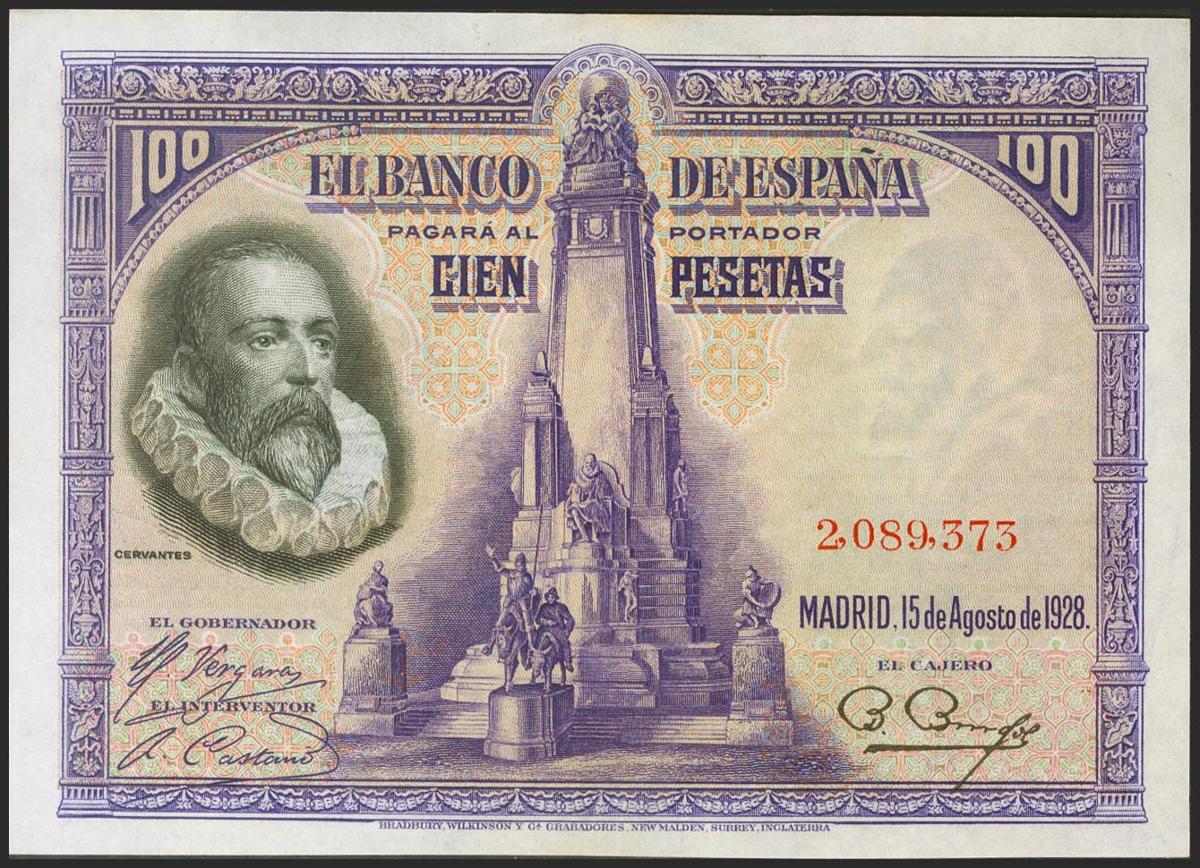 100 pesetas. August 15, 1928. No series. (Edifil 2021: 355). Rare in this quality, original sizing. Good Extremely Fine.