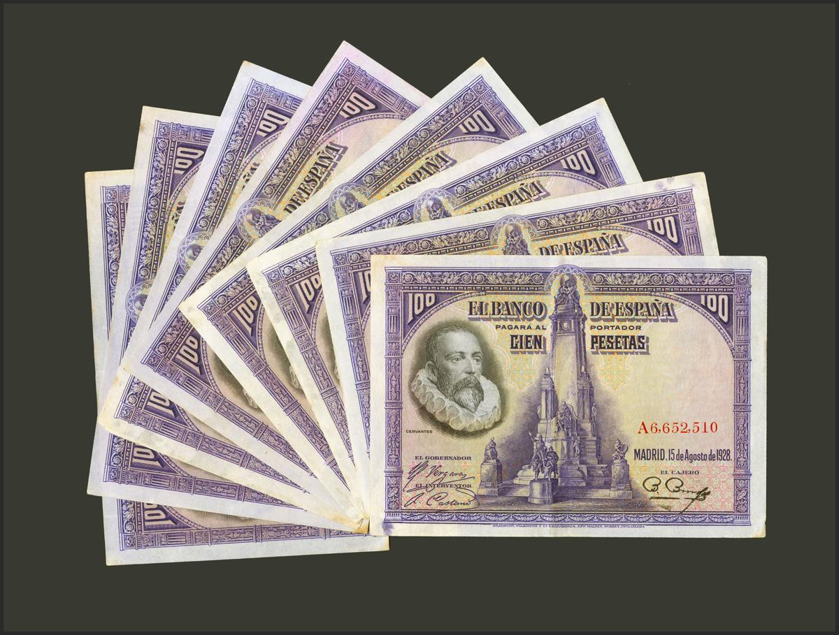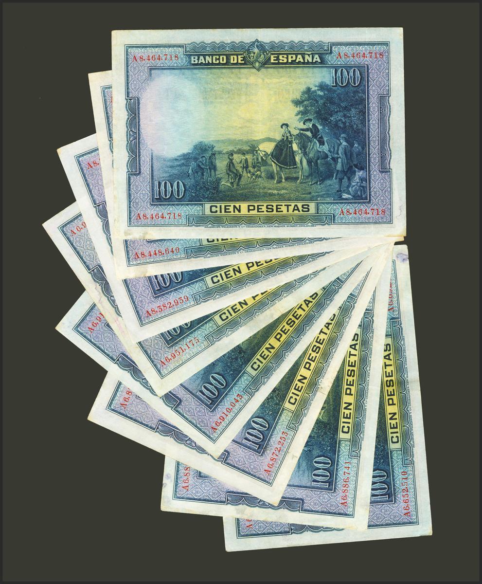 Set of 8 100 Pesetas banknotes issued on August 15, 1928, with series A. (Edifil 2021: 355a). Almost Very Fine/ Almost Extremely Fine. TO EXAMINE.