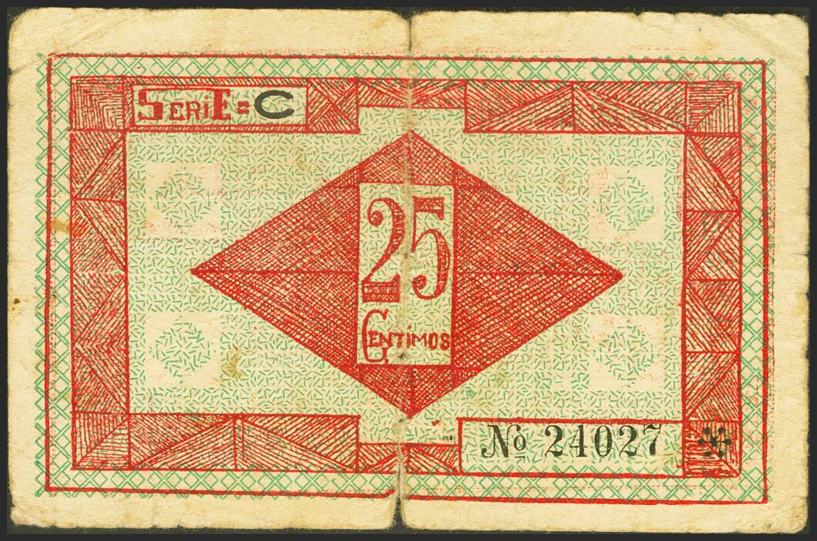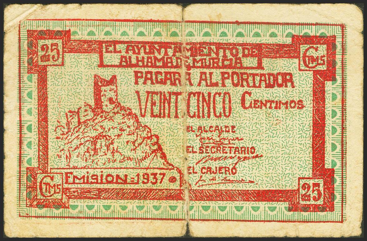 ALHAMA DE MURCIA (MURCIA). 25 cents. 1937. Series C. (González: 495). Unusual. Almost Fine.