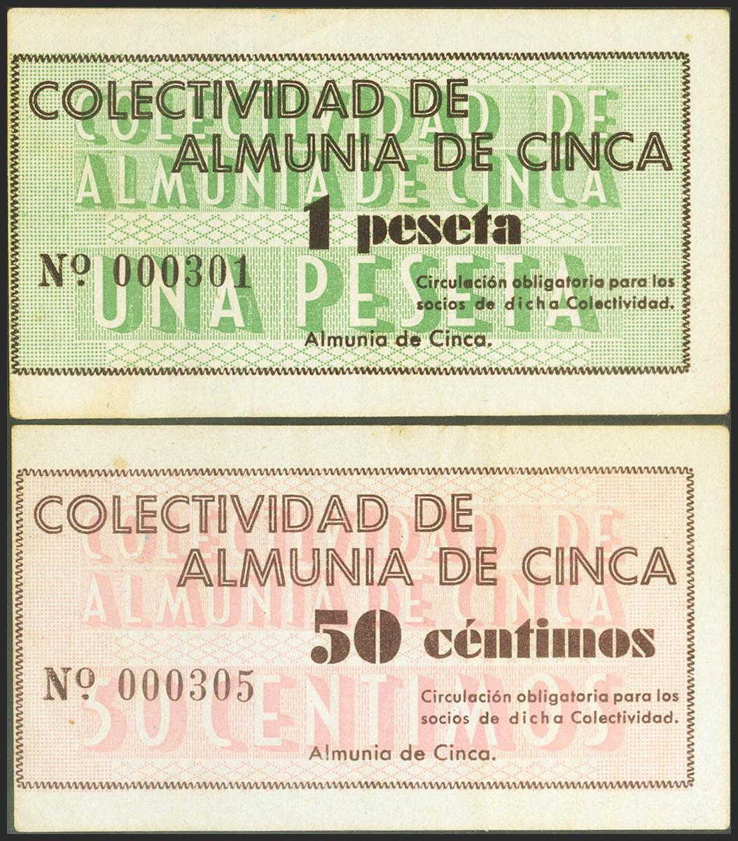 ALMUNIA DE CINCA (HUESCA). 50 cents and 1 Peseta. (1937ca). (González: 629, 630). very rare Very Fine.
