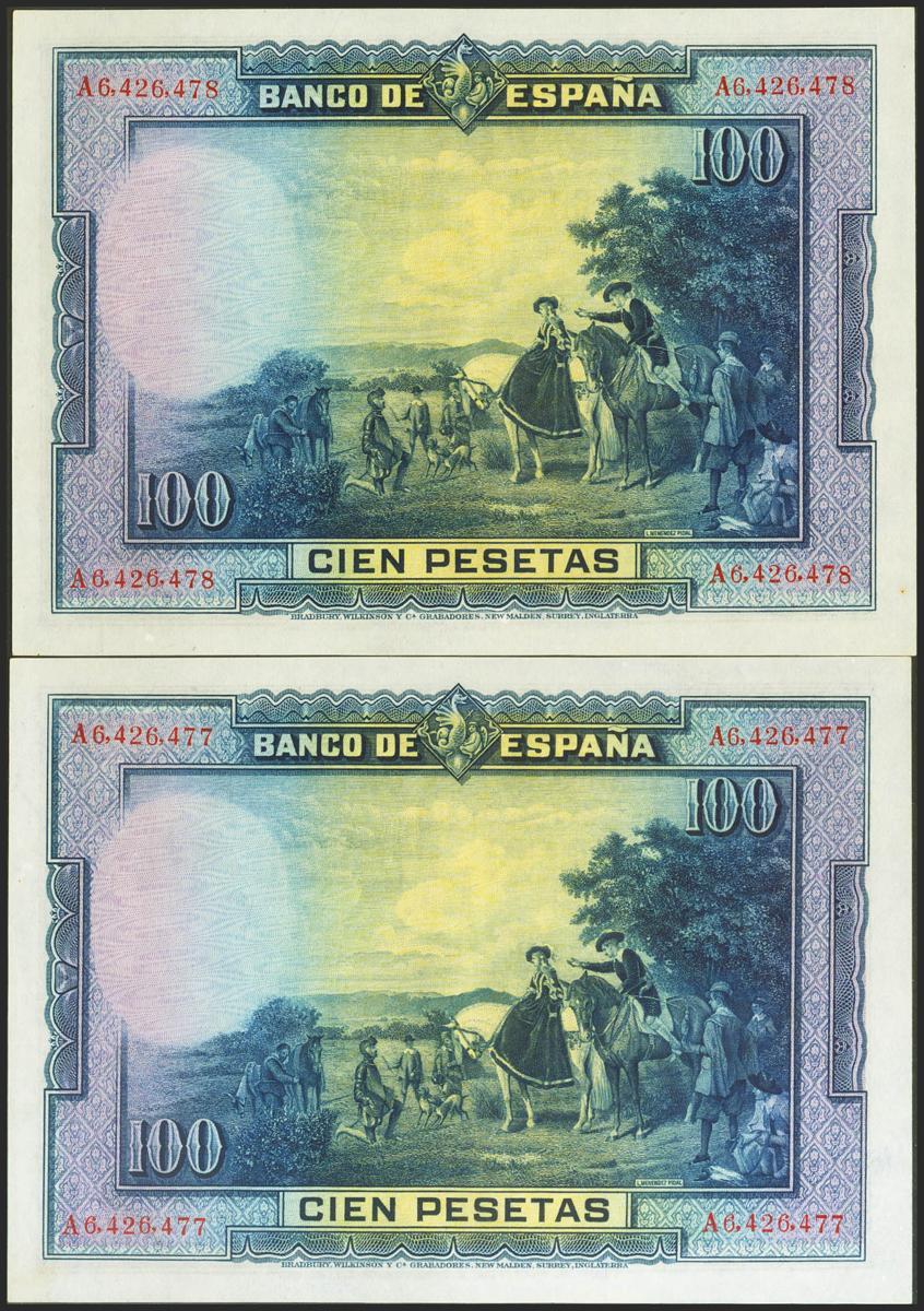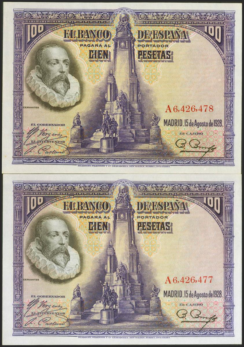 100 pesetas. August 15, 1928. Correlative couple. Series A. (Edifil 2021: 355a). It retains much of the original sizing. Uncirculated.