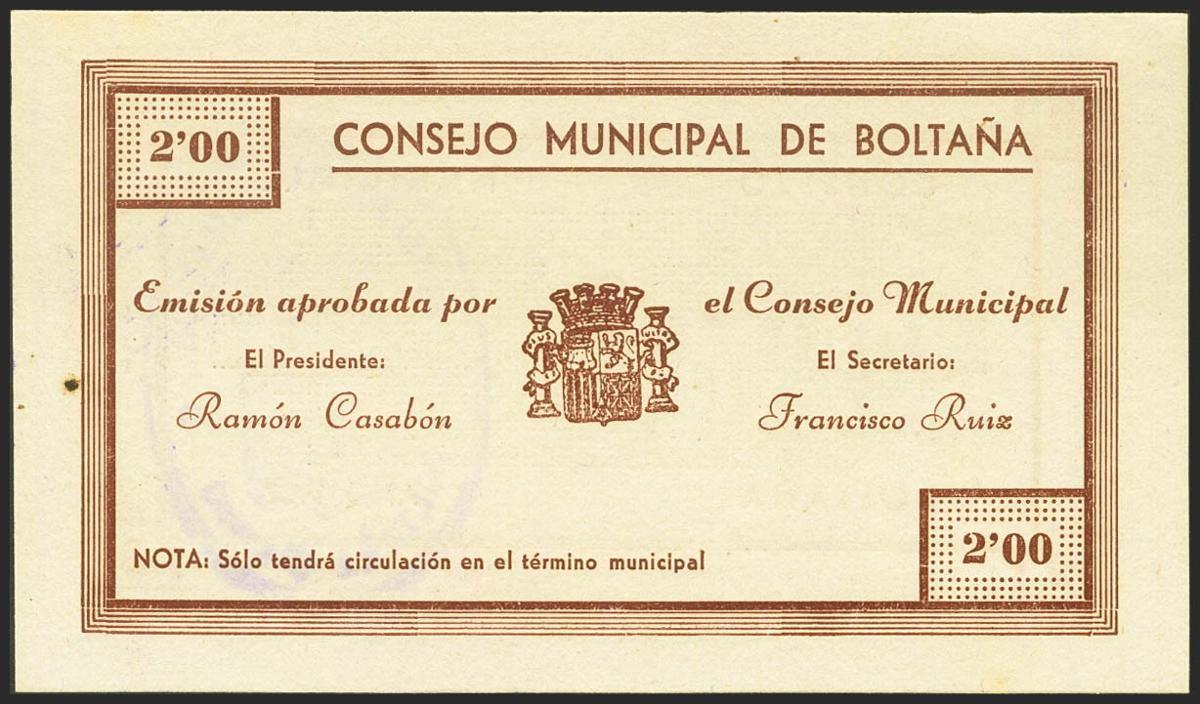 BOLTAÑA (HUESCA). 2 pesetas. 1937. Series B. (González: 1271). Unusual. Extremely Fine.