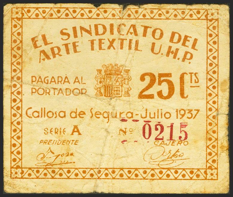 English CALLOSA DE SEGURA (ALICANTE). 25 cents. July 1937. Series A. (González: 1426). Unusual. Almost Very Fine.