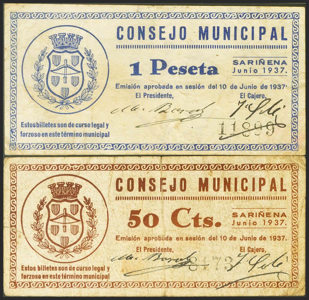 SARIÑENA (HUESCA). 50 Cents and 1 Peseta. June 10, 1937. (González: 4785/86). Complete series. Very Fine.